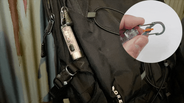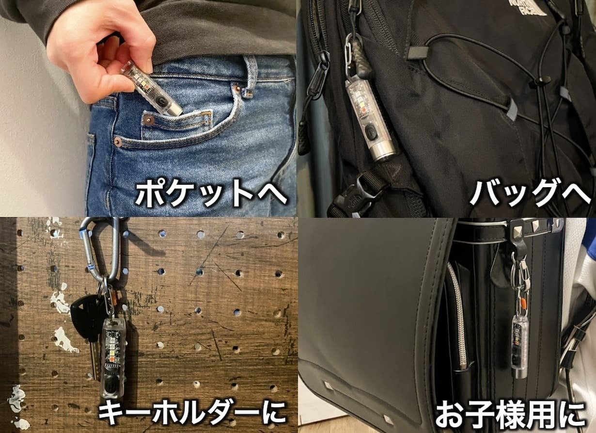 小さすぎて無くしてしまわないようにロック機能付きカラビナでキーホルダーとしてバッグなどに取り付けるのもオススメです!