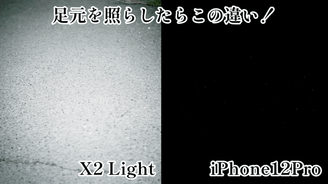 暗い場所で比較するとこの違い!夜道の防犯対策として自分の周りを明るく照らすことが重要です。