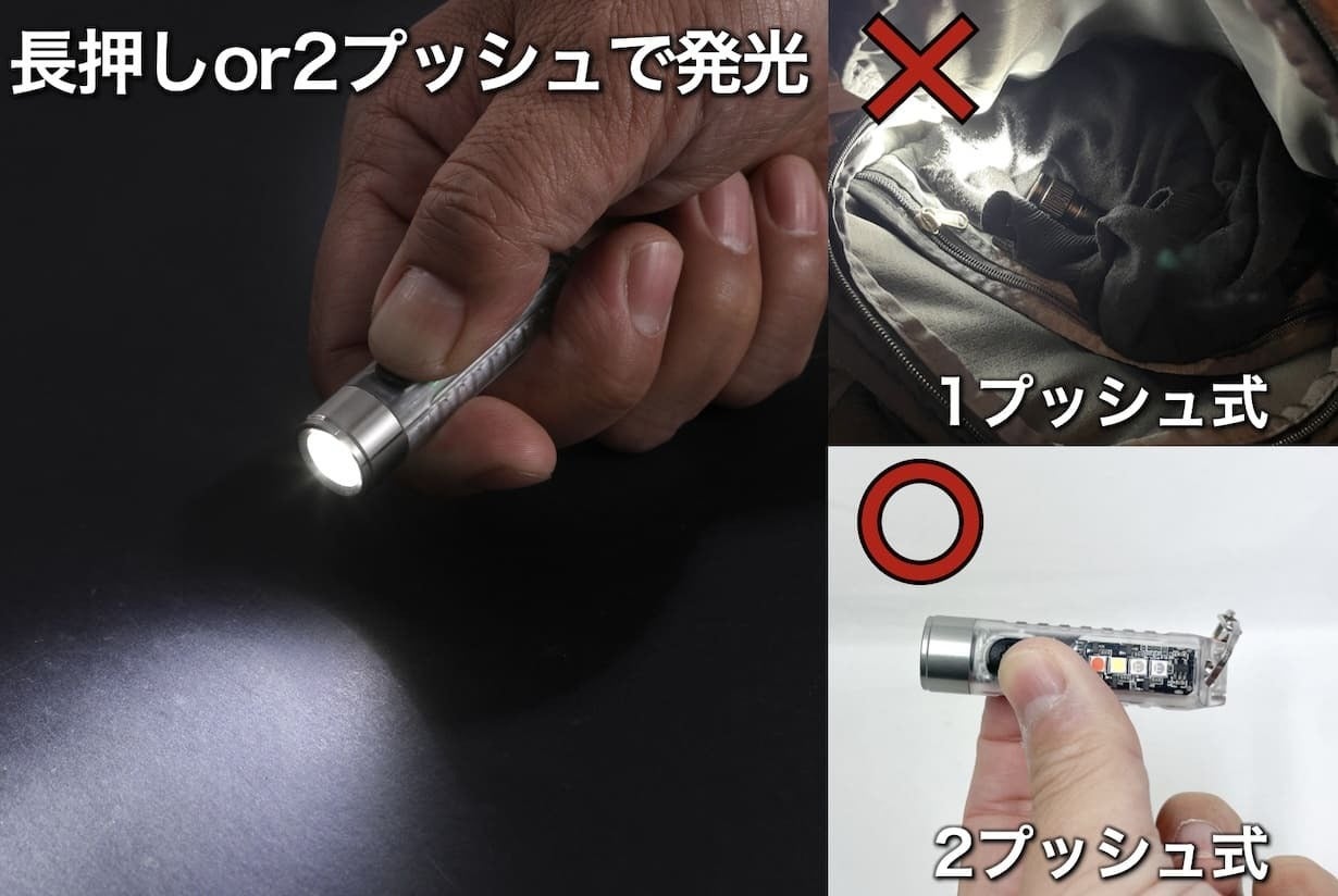 X2 Lightは長押しもしくは2回以上スイッチをプッシュしないと連続点灯しないから、勝手にスイッチが入ってしまうような誤作動が起きにくい設計になっています。