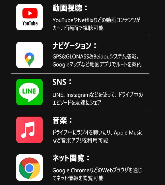Android10システムを搭載しており、あらゆるAndroidアプリに対応しております。さまざまな動画やアプリ・ゲームを車内で楽しむことができます。