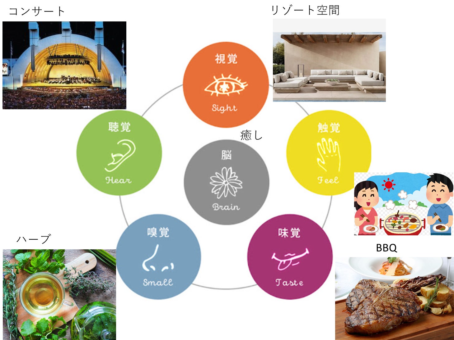 以下の通り、五感に刺激を与えることで、脳を刺激し、最高な仲間と極上な「癒し」を体験いただける場所にしたい。