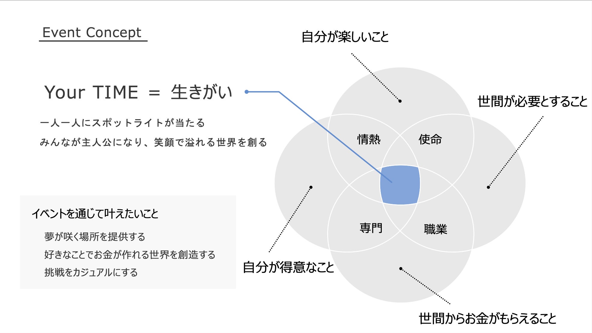 「Your TIME.」のコンセプトは、人々がただ観客として参加するのではなく、自分自身が主役として活躍する場を提供することです。これは、単にイベントを見に行くのではなく、参加者自身がそのイベントの主役として参加し、積極的に関わり、自分の夢や目標を追求する機会を得ることを意味します。従来のイベントや交流会では、参加者はプログラムを観賞したり、他人の活動を見学したりすることが一般的です。「Your TIME.」では、参加者自らが主役となることで、自分の夢や目標を追求し、活動を通じて成長する機会を提供しています。