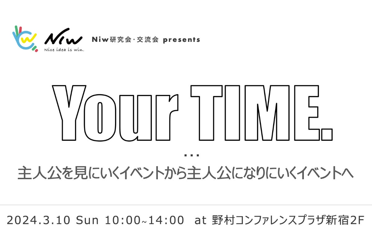 Niw研究会・交流会主催イベント「Your TIME.」を 2024 年3月10日(日)に新宿野村ビル2階 野村コンファレンスプラザ新宿を会場に開催させていただくことになりました。皆様のサポートのおかげです、いつもありがとうございます。