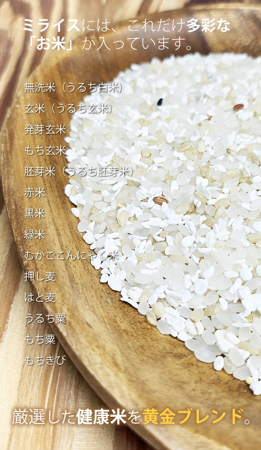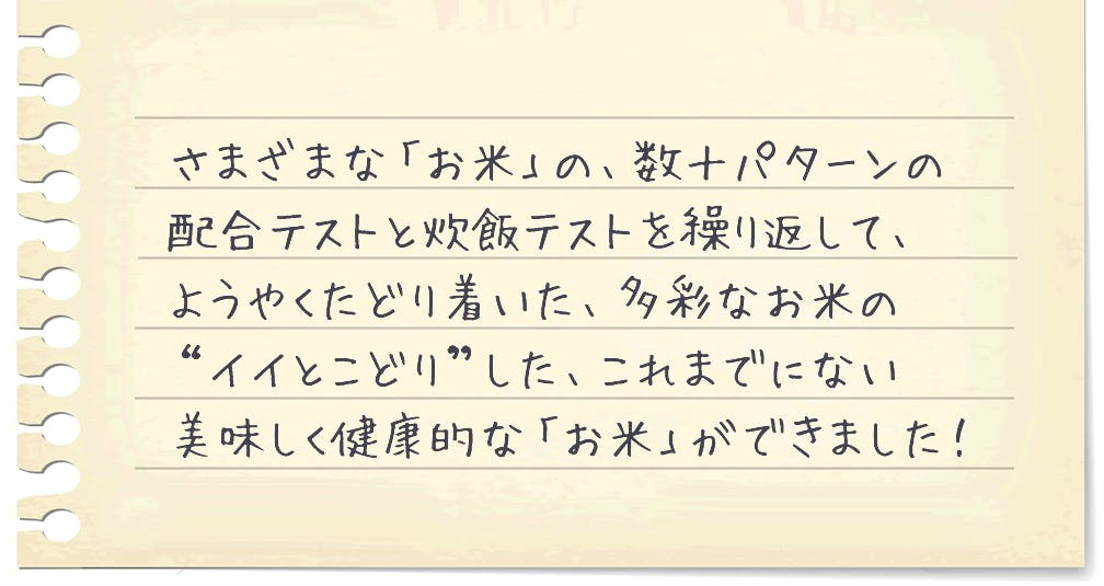 私たちおどろきっちんがこれまで取り扱ってきた、様々なお米(有洗米・無洗米・一等米・二等米・特栽米・棚田米・各銘柄米・玄米・胚芽米・分づき米・雑穀米・こんにゃく米etc...)を、様々な配合で、様々なそれぞれの特長を活かしながら、数十回におよぶ実際の炊飯テストと試食を繰り返してきました。そうしてようやく「これだ!」という黄金ブレンドに到達したのが、このミライスです。その評価基準は「そのごはんは美味しいか?」「そのごはんは健康的か?」の2点にフォーカスして、配合・試食テストを繰り返しました。そうして生まれたのがこの「ミライス」なのです。
