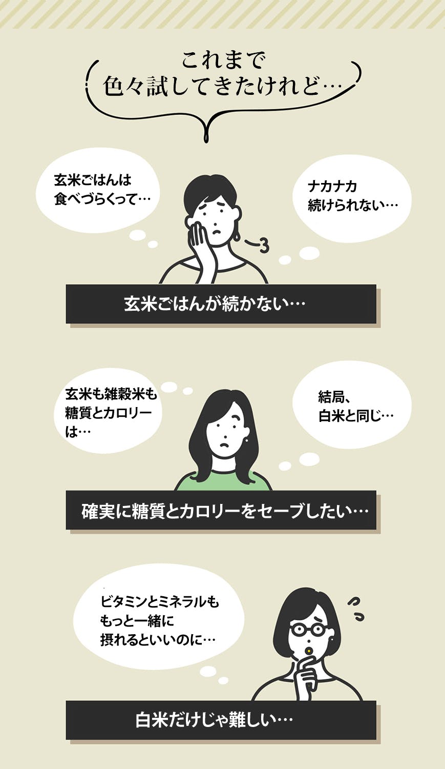私たちの「主食」のごはんって毎日のこと。 でも摂り過ぎていませんか?主食での「カロリー」と「糖質」。 足りていますか?主食での「食物繊維」と「ビタミンミネラル」。いつも当たり前のように食べている白ごはん(白米)はとても美味しいものです。ですがダイエットや健康を気に掛けるなら、今一度毎日の「ごはん」、つまり毎日の「主食」を見直してみてはいかがでしょうか?