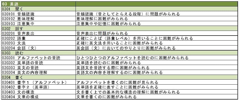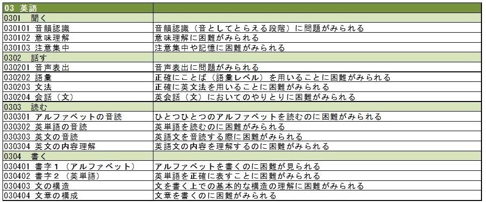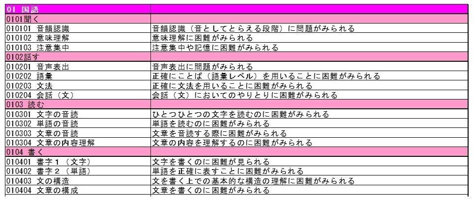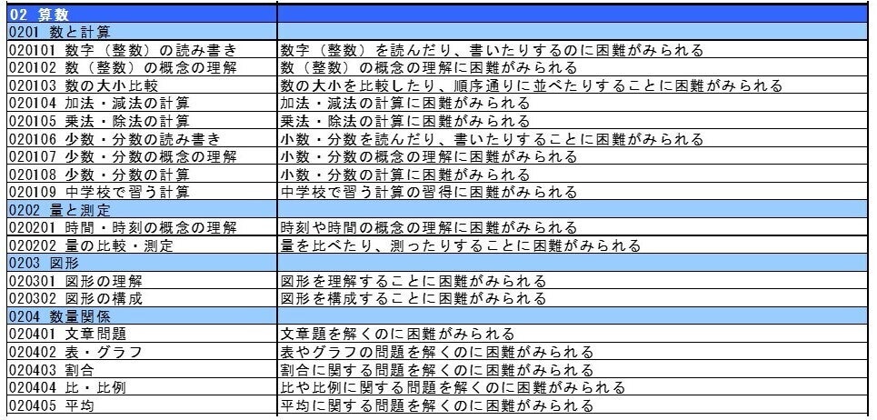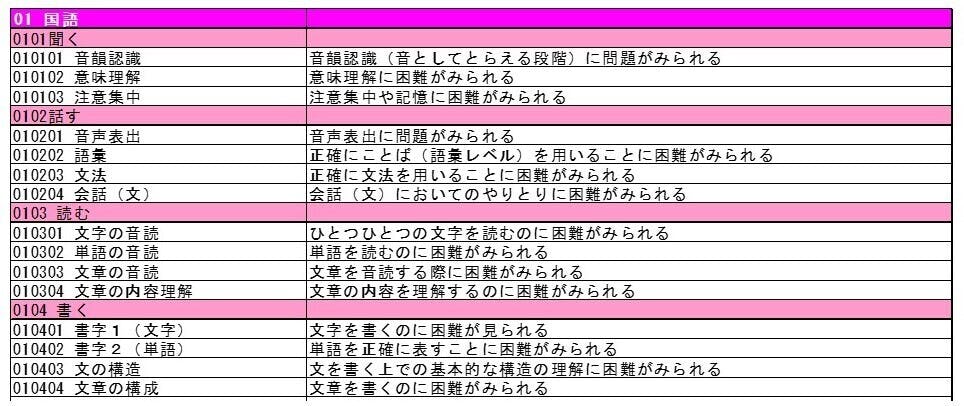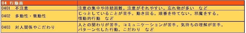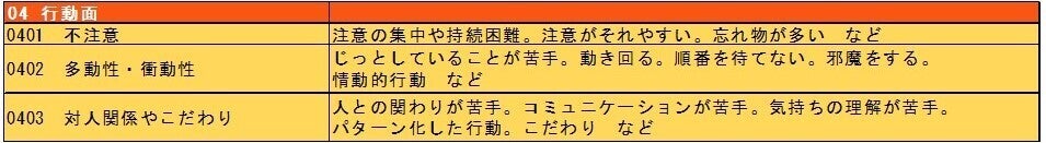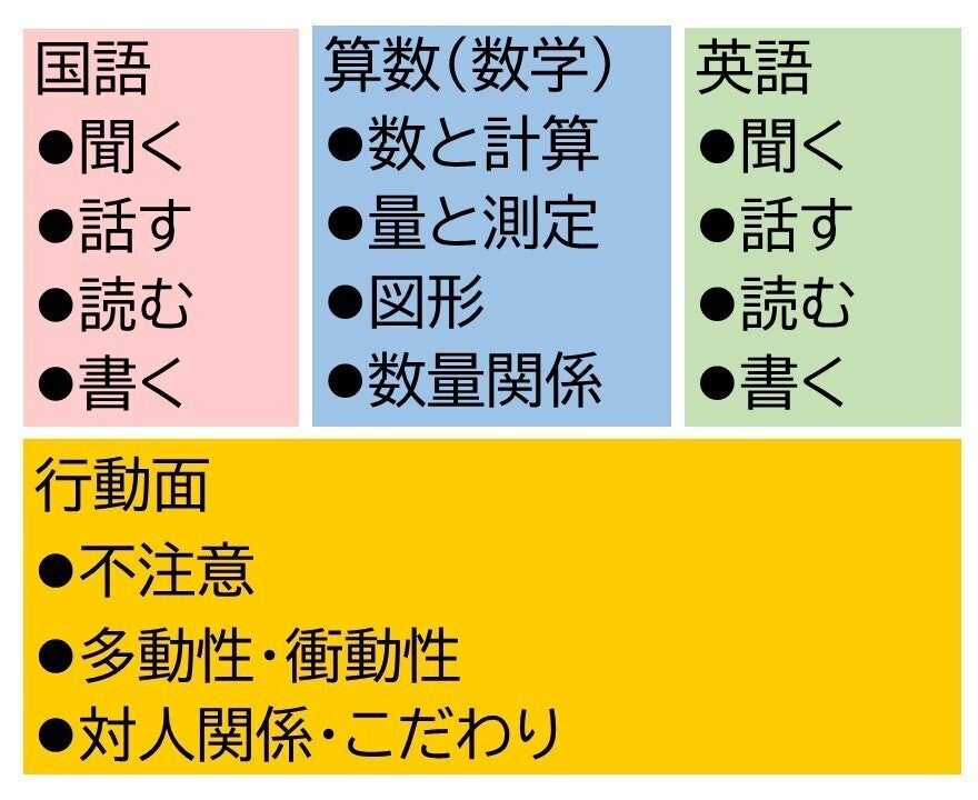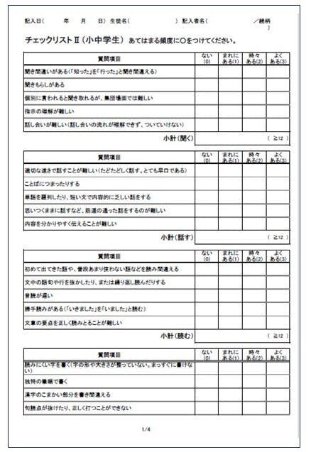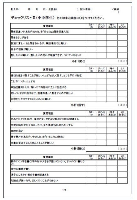 ・「聞く」「話す」「読む」「書く」「計算する」「推論する」「不注意」「多動性・衝動性」「対人関係・こだわり」の項目ごとにチェックリストがある。
