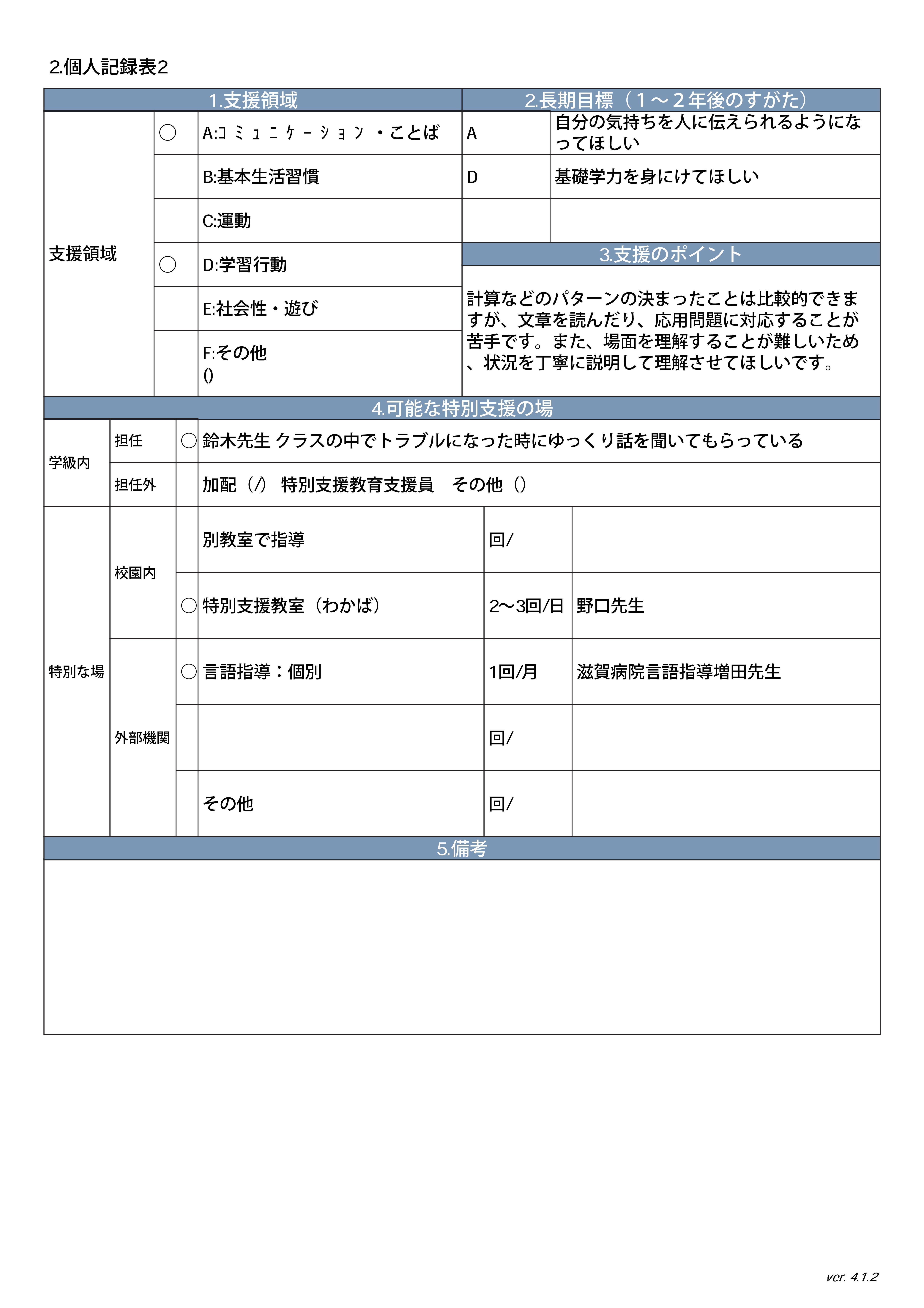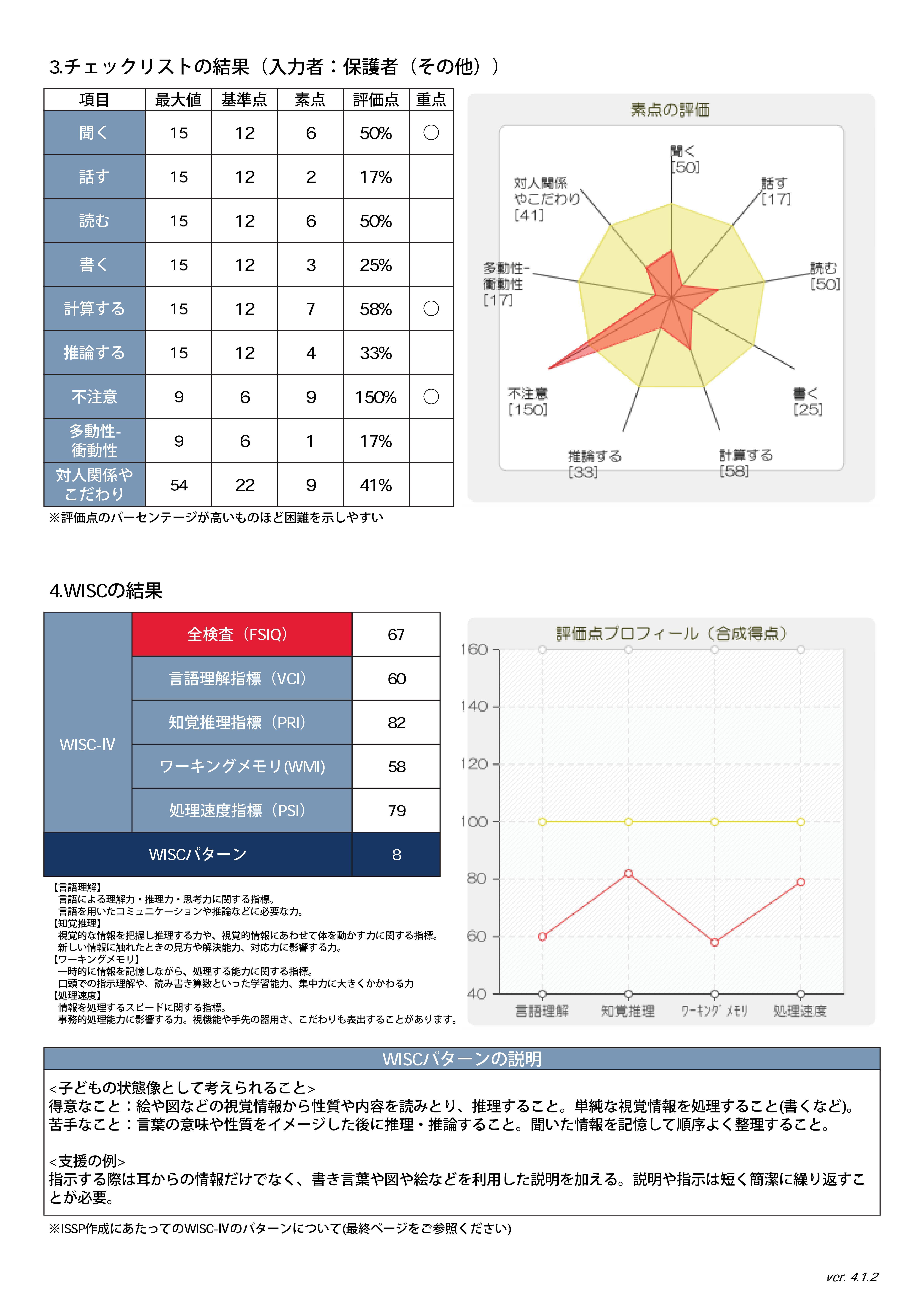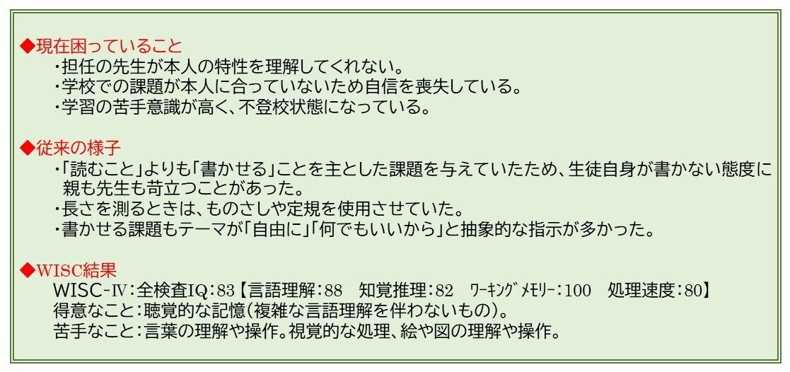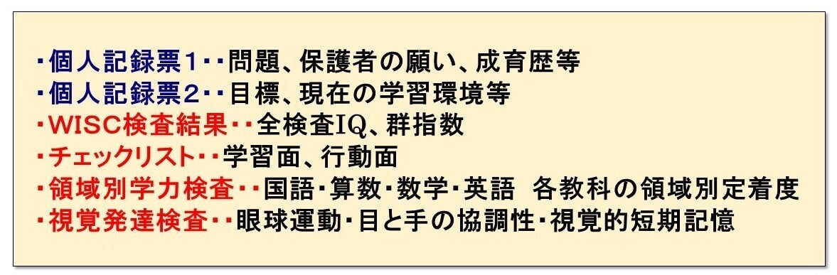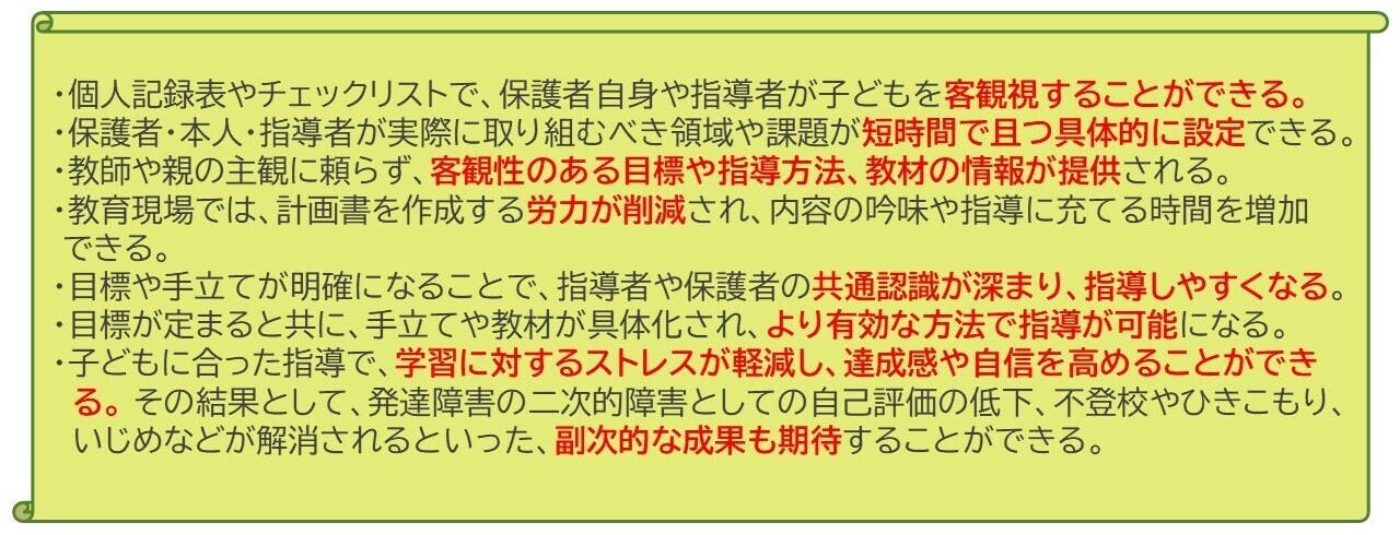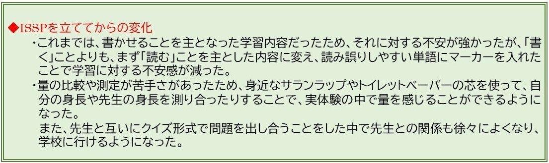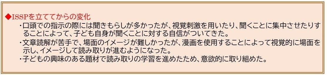そして、個別の学習指導計画(IEP:教育課程を具体化し、一人ひとりの指導目標・内容・方法を明確にし、きめ細かく指導するための計画書)をより学習面と行動面の支援に特化させ、「読み」「書き」「計算」の学習や注意集中、対人関係などの目標や具体的な手立てを、知能発達検査およびチェックリストにより認知特性を把握した上で、学校や家庭での学習支援や評価を行いやすくした計画書を作成することができました。