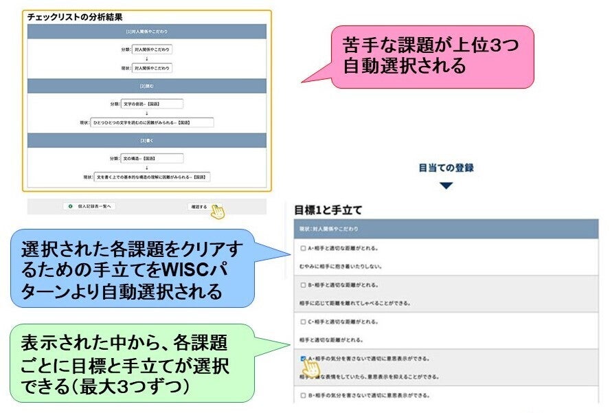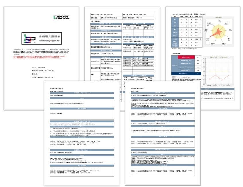 そして、所定の演算を経て、子どもたち一人ひとりの認知特性に応じた学習指導の目標や手立て、おすすめの教材などが盛り込まれた支援計画表が自動的に作成される、というものです。