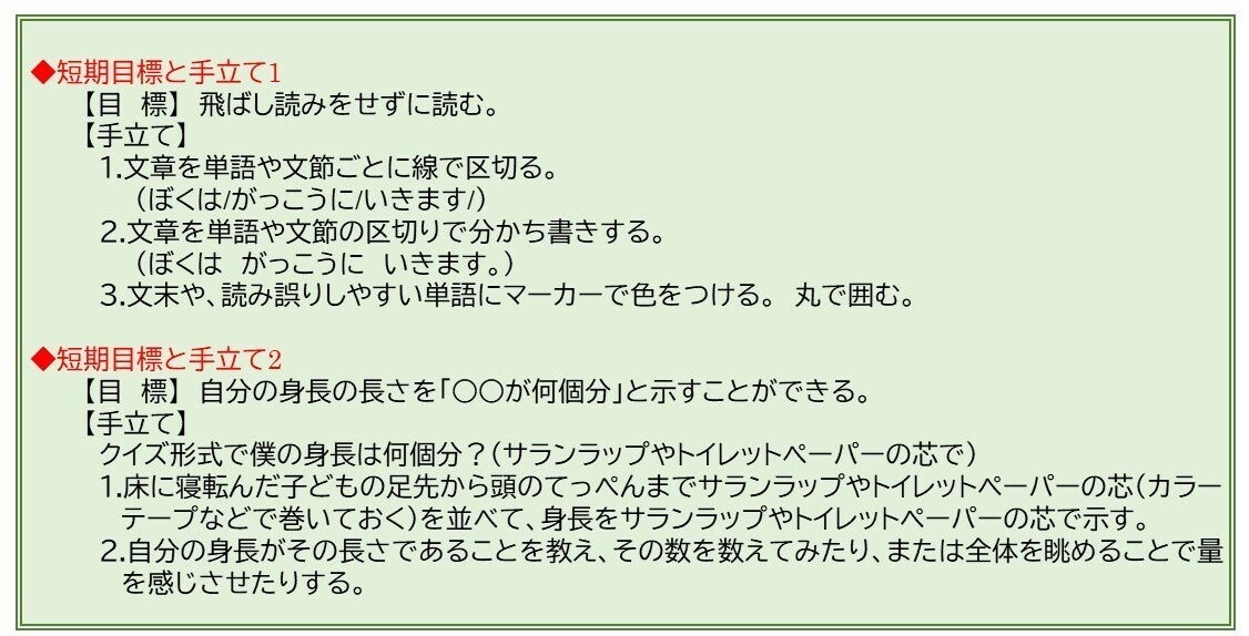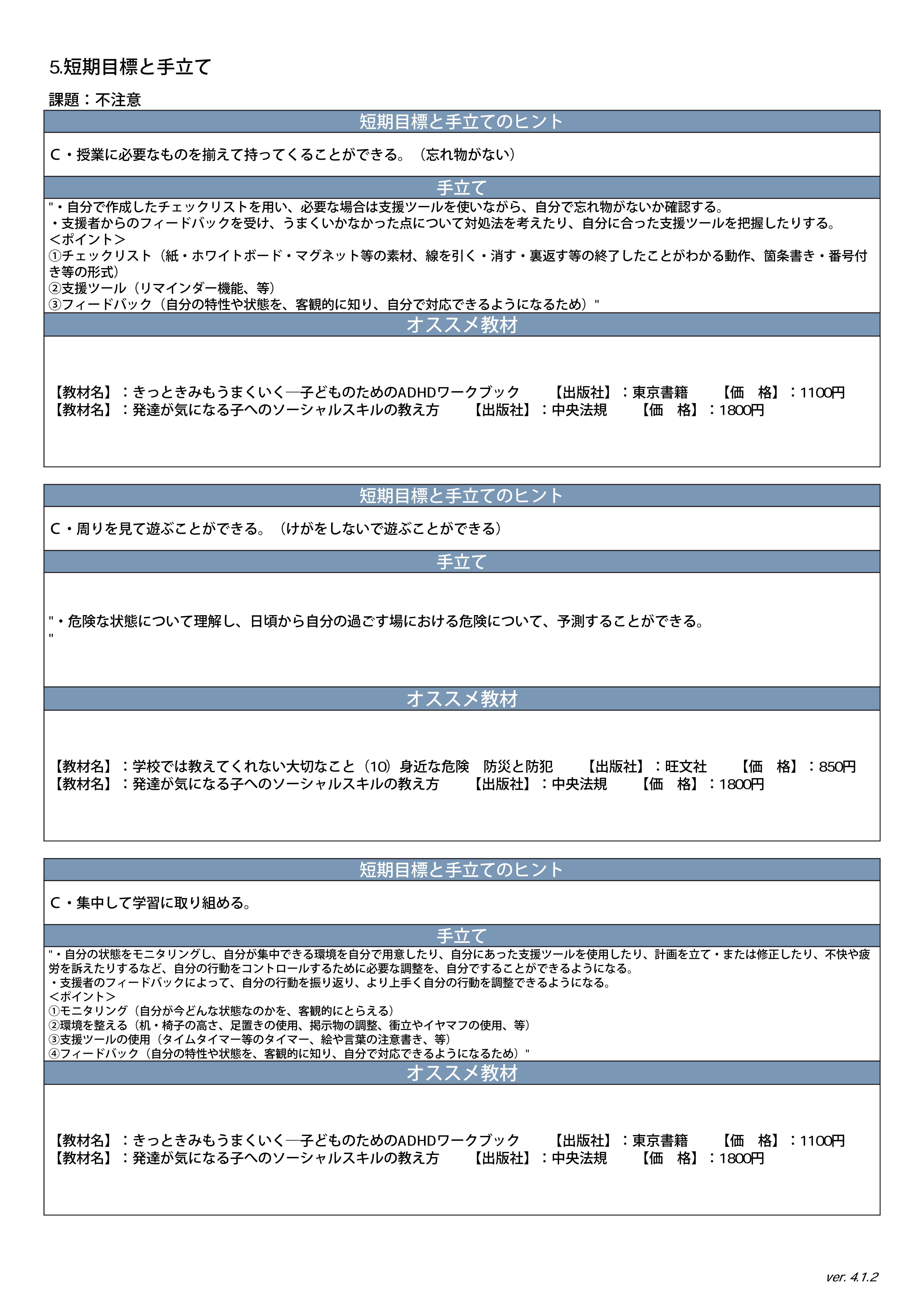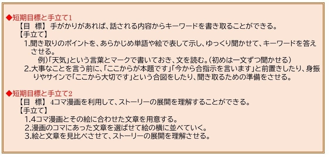 ・一つずつの課題に対して、「短期目標」「手立て」「おすすめ教材」が表示される。