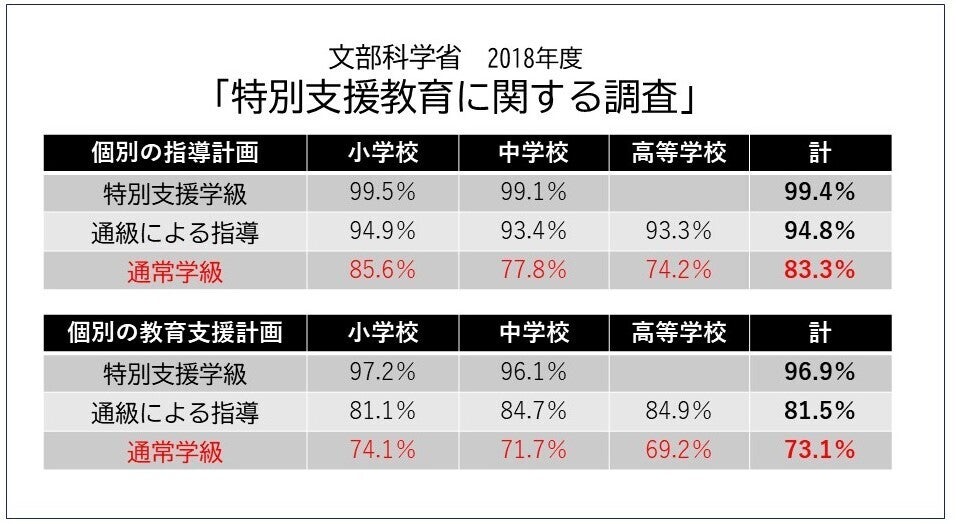 2018年度の文科省の「特別支援教育に関する調査」によると、通常学級に在籍する支援が必要な児童に対しての作成率は、特別支援学級在籍や通級指導を受けている児童に比べて低くなっています。それは、現場の教師の指導歴(知識や経験)によっての意識の差があったり、作成のための時間の確保が難しかったり、事務量のさらなる増加への危惧が存在するなどが考えられます。
