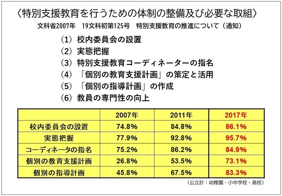 文科省によると、「個別の教育支援計画の策定と活用」と「個別の指導計画の作成」については、2007年で26.8%と45.8%に対して、2017年にはそれぞれ73.1%と83.3%と作成率は高くなっています。