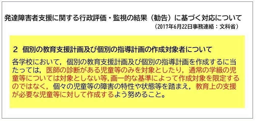 しかし、2017年以下の文科省の事務連絡にあるように、この個別の教育支援計画及び個別の指導計画の作成にあたっては、診断がある児童のみ対象とするような画一的な基準によって作成対象を限定せず、教育上の支援が必要な児童等に対して作成に努めると明記されました。