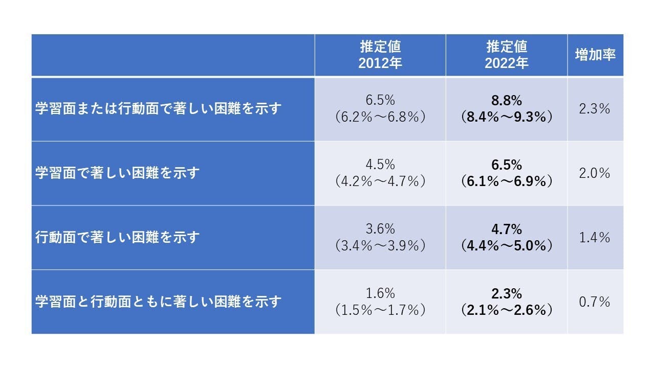 文部科学省(以下、文科省)によれば、通常の学級に在籍しながら、学習面および行動面でなんらかの困難を示している、発達障害の可能性があり特別な教育的支援を必要とする児童生徒の割合は、2012年では全体の約6.5%、2022年には約8.8%と増加率2.3%となっています。