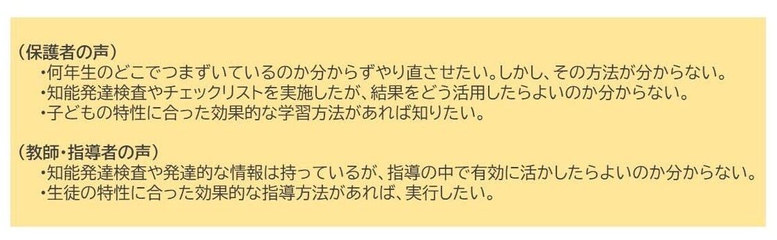 このような状況や以下のような保護者や教師・指導者の声を鑑み、弊社は、2009年より、個別の指導計画のうちのとくに学習領域に絞り、コンピュータを活用することで、子どもたち一人ひとりのニーズに対応した、有用性の高い「個別学習支援計画書(ISSP)」を提供することのできるシステムの開発を行なって参りました。