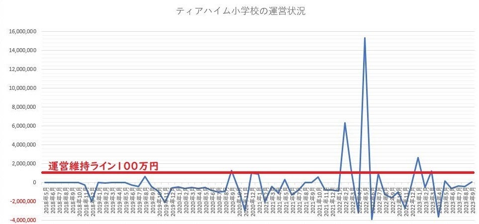ティアハイム小学校の毎月の運営維持ラインは100万円です。40匹の猫達の暮らしと健康を守り、施設の家賃や光熱費を払い、スタッフの生活を守るための給料を確保できるのが運営維持ラインです。上のグラフを見て分かる様に、ほぼ達成できておりません。