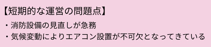 加えて、施設の老朽化に対応するために、以下の改善が急務となったことも、追い打ちをかけられました。