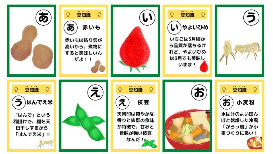 絵札、読み札はそのままですが、読み札の後ろに豆知識を追加することによって、より詳しい知識を得られるようにしてあります。豆知識には、其々の野菜の歴史、栄養素、旬、栽培方法、味などの様々な観点からの情報を組み込んでいます。
