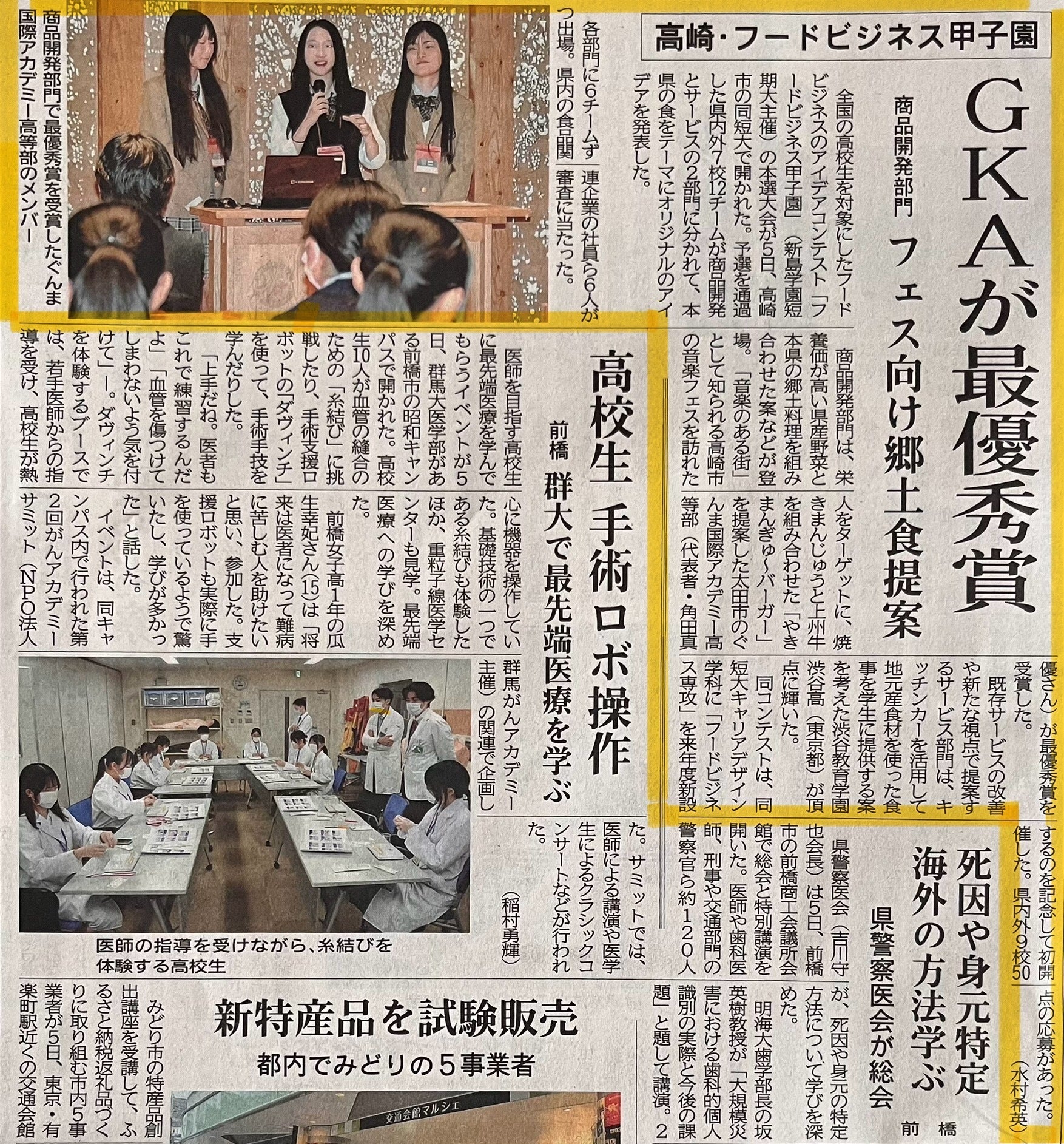 2024/10/10 11:0310月5日に新島短期大学で行われた全国フードビジネス甲子園に商品開発部門で出場し、最優秀賞をいただくことができました!私たちは高崎市の特産品である焼きまんじゅうと群馬県のブランド牛である上州牛を組み合わせた、やきまんぎゅ〜バーガーというものを提案しました。高崎市の音楽の街と言う特性を生かして、フェスなどで販売することにより、他県の人により群馬県の食の魅力を知ってもらいたいと言う思いでこの商品を考えました。このときの様子が、上毛新聞に掲載されましたので、ぜひご覧ください! もっと見る