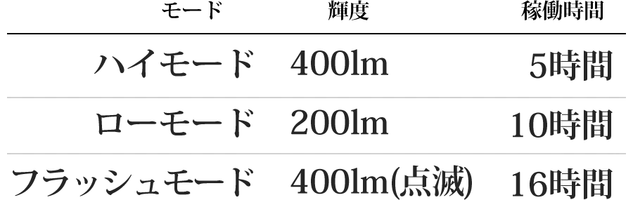 3つの照明モードを利用シーンに応じて使い分けることで、稼働時間をコントロールすることも可能です。