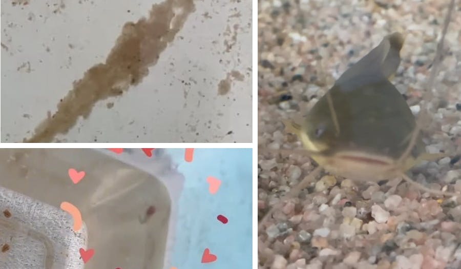 左上:ナマズの卵 左下:孵化したばかりのなまちゃん 右:現在のなまちゃん
