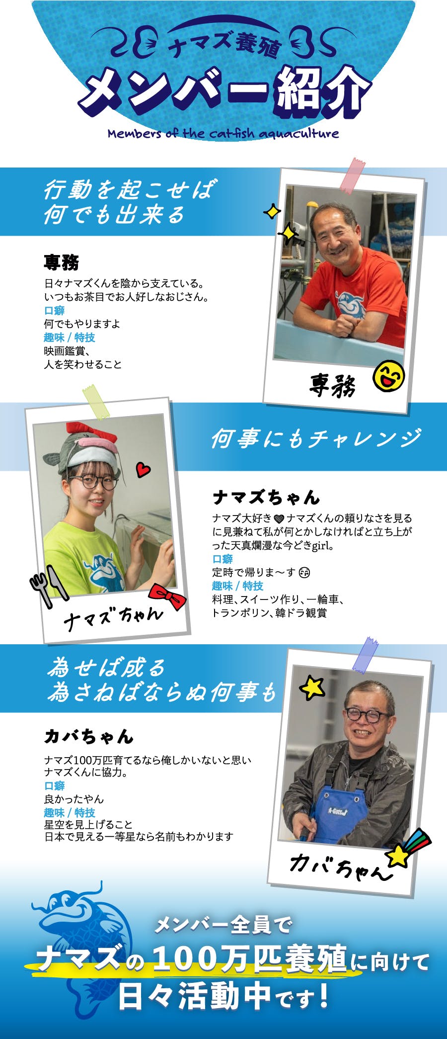 私たちは、このプロジェクトを通じて多くに方にナマズ養殖のことを知ってもらい、食としてのナマズの普及に努めます。また、奇跡的に生まれた「なまちゃん」を大切に育てて、春先から実施する子供たちに向けた「ナマズにエサをあげる体験会」のマスコットキャラクターにしたいと考えています。