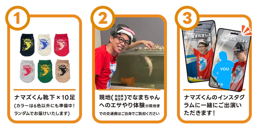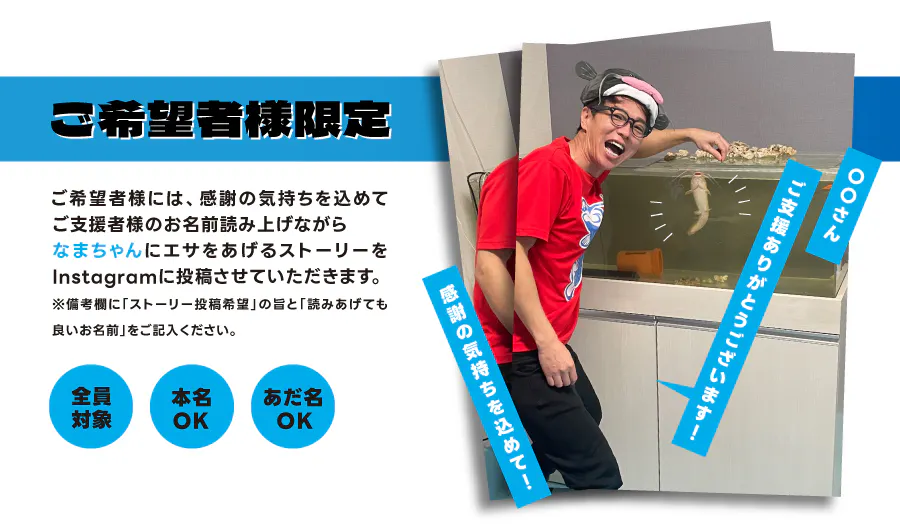 全てのリターン・ご希望者様全員が対象!ご支援者様のお名前を読みあげながら『なまちゃん』へエサをあげるストーリーをInstagramへ投稿させていただきます。ご希望の方は備考欄に「ストーリー投稿希望」の旨と「読みあげても良いお名前」をご入力ください。