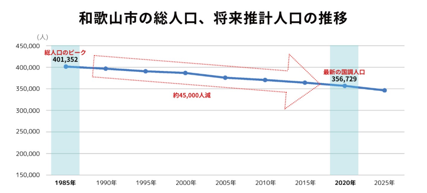 国立社会保障・人口問題研究所の調査によると、和歌山市の人口は1985年(昭和60年)には40万1,352人でしたが、それ以降減少が続き、2020年(令和2年)には35万6,729人となりました。
