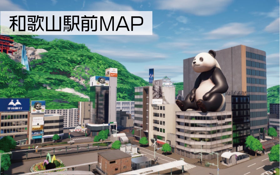 JAビルを中心としたリアルな街並みに加え、和歌山城や那智の滝などの観光スポットが融合し、ビルの上には巨大パンダが、空にはくじらが泳ぐ、和歌山の魅力を詰め込んだ空間です。