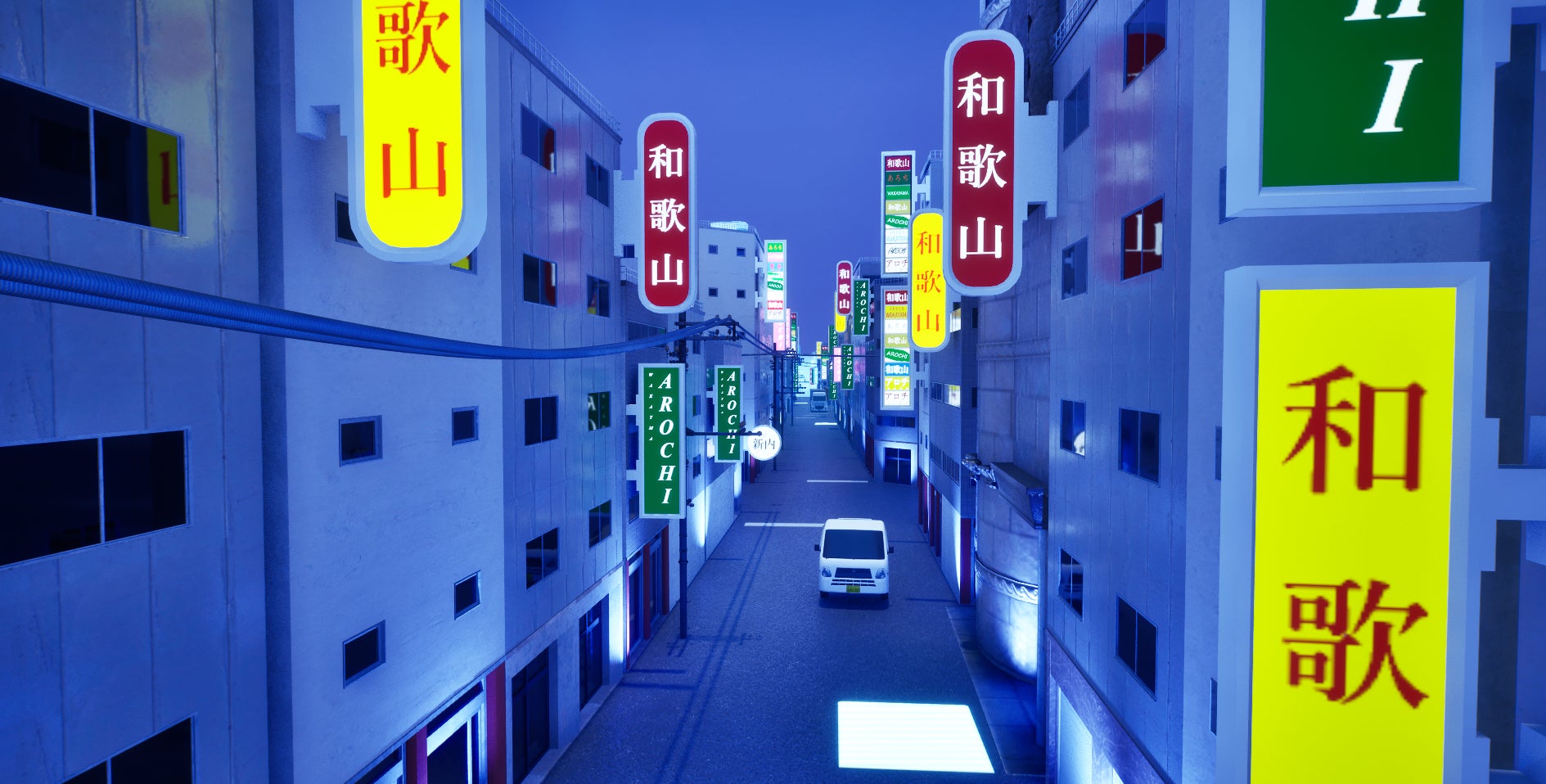 新内をネオンが輝くきらびやかな雰囲気で表現しています。現実と同じ風景ながらも、ゲームでしか味わうことのできない雰囲気を楽しんでいただけます。
