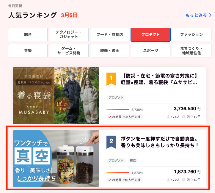 皆さんこんばんは、Brightチームです。この度は「「ボタンを一度押すだけで自動真空。香りも美味しさもしっかり長持ち!【SHELBRUスマートキャニスター】」を支援いただき、本当にありがとうございます。おかげさまで開始から2時間で目標を達成することが出来ました。また本日の人気ランキングプロダクト部門で2位に入賞することが出来ました!・真空から解除までがボタン1つ押すだけ!シンプル操作でたった15秒で真空が作れる。・最大20Kpaの強力な吸引力で余分な空気を抜いて酸化や湿気、ホコリなどから食材を守る!・真空度が下がると勝手に酸素を放出!お気に入りのコーヒー豆やシリアルなど、美味しさが長持ち!皆さまの支援を励みに、喜んでいただける製品作りに努めてまいります。https://camp-fire.jp/projects/view/7310824月中旬まで販売期間は続きますので、ぜひSNSでのシェアや身近な方にもおすすめしていただけると嬉しく思います。#shelbru #brightdiy どうぞよろしくお願いいたします。ありがとうございました。Brightチーム