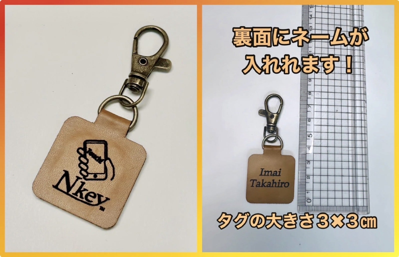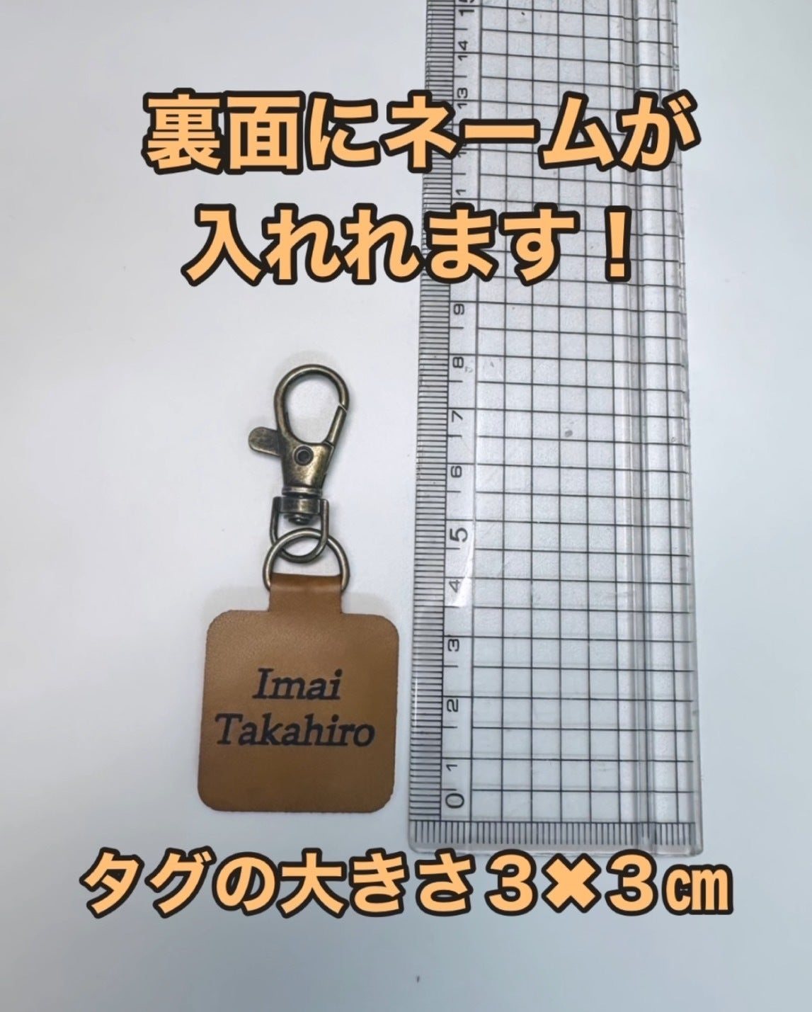 ※大きさ:タグ部分は横3.2㎝×縦3.2㎝×厚さ3㎜ キーホルダー部分を含めても、縦8㎝弱です。
