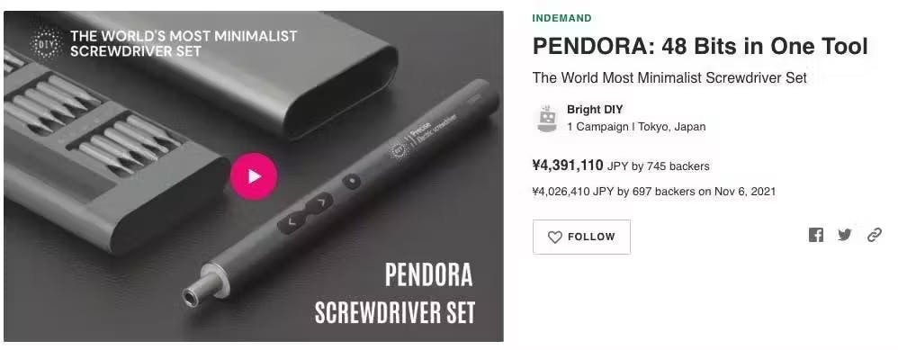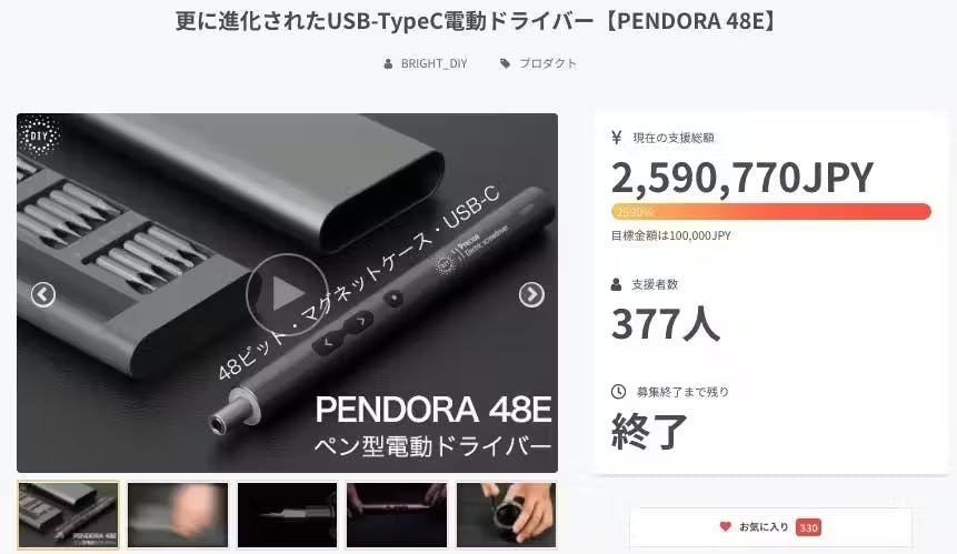 過去海外大手クラウドファンディングサイト海外クラウドファンディングで745名から、国内大手クラウドファンディングサイトでもPENDORA 48E/mini累計で約2000名よりご支援頂いております 電動ドライバーセット"PENDORA 48E"が、付属のビットを100本に増量し進化を遂げて帰ってきました!