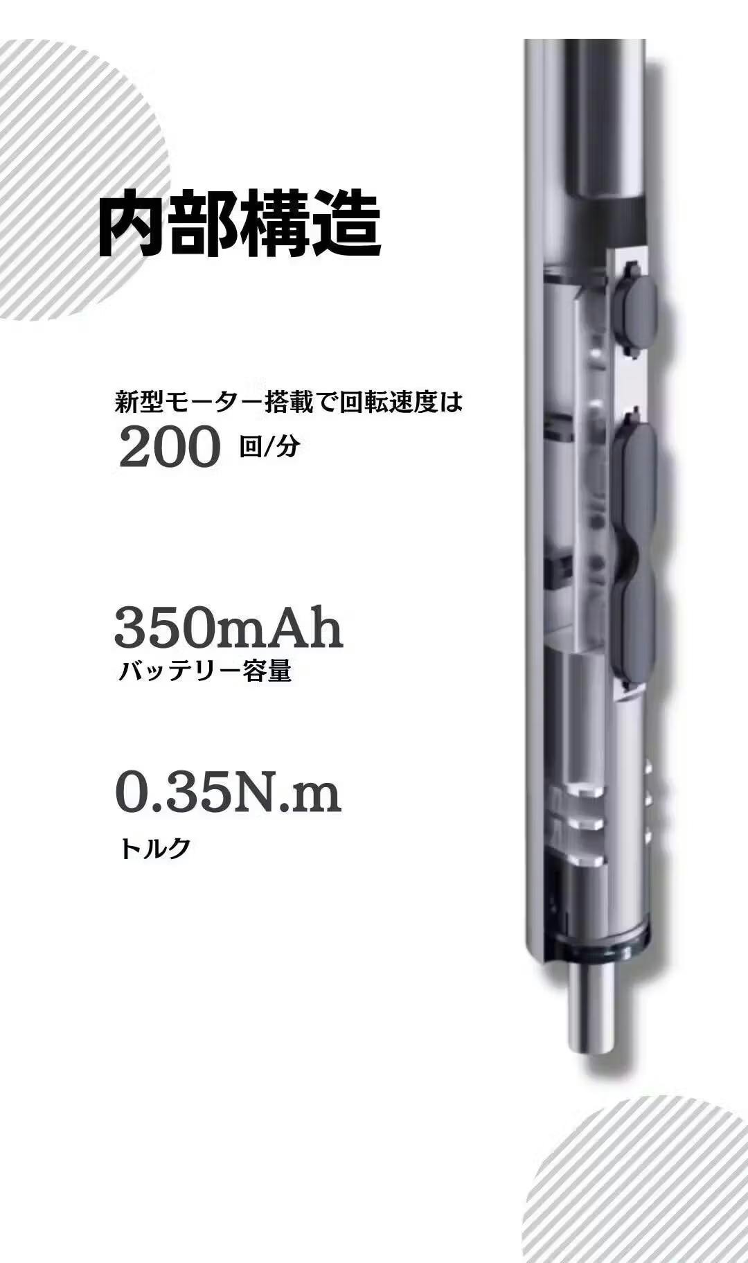 ・ドライバー内蔵の超小型モーターは「1分間あたり200回転」の高性能で作業時間を短縮。もっとDIYを楽しみましょう。