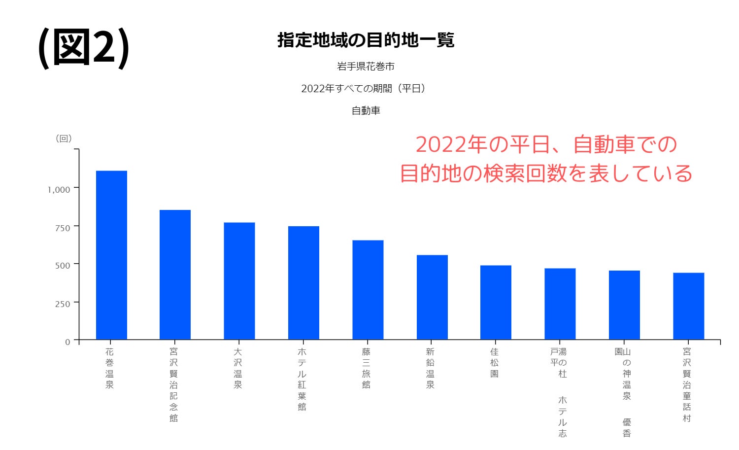 しかし、花巻にはたくさんの観光資源があるにも関わらず、温泉にしか観光客が集まらない傾向があります。(図2)具体的には、花巻市の目的地検索回数を見ると、上位の多くが温泉であり、宮沢賢治記念館などの施設が一部ランクインしているものの、回数が少ないことが分かります。
