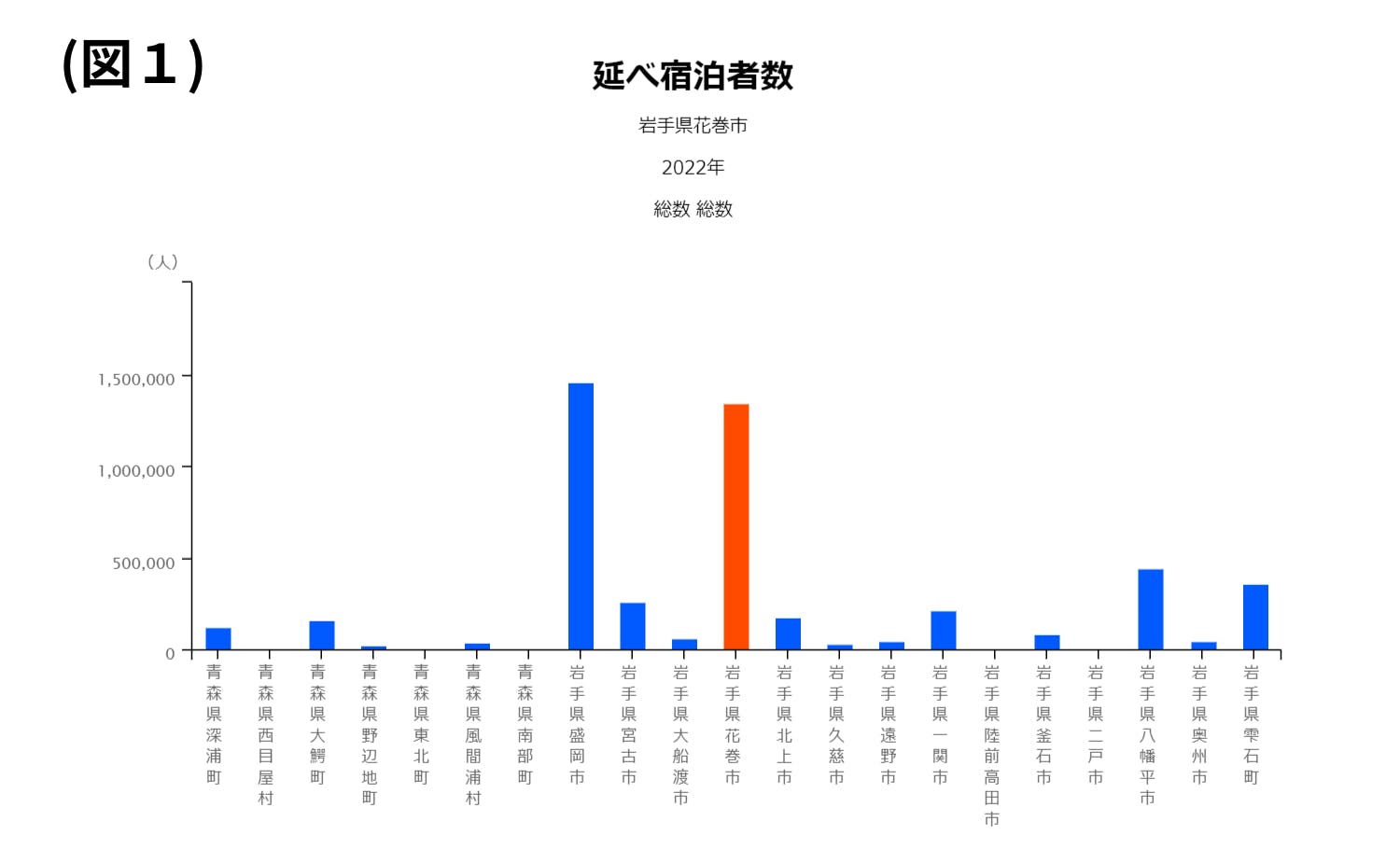 花巻市には、数多くの温泉、宮沢賢治をはじめとした偉人にまつわる施設、わんこそば、昔から愛されるマルカンビル大食堂などの食、花巻まつりをはじめとした古くから続く地域の祭り、魅力的な観光地がたくさんあります。岩手県では、トップレベルの観光資源の豊富さだと感じます。特に、温泉が数多くあり、多くの人が温泉に訪れています。RESASからのデータで、花巻市は岩手県内で盛岡に次ぐ宿泊者数をほこっております(図1)。