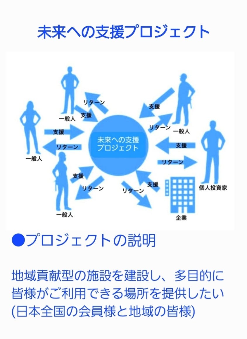 2024年1月7日より、私たちは『一億人で 未来への夢を叶えよう!』というプロジェクトを始動させます。私たちの目的は、明るい未来を作り出すために、また存続させる大黒柱となる支援金(会員)とが共同貢献できるチャレンジでもあり、地域の発展に貢献する場所を増やしていける何かの切っ掛けつくりとそれを継続し、提供していくことです。(日本全国の会員対象)
