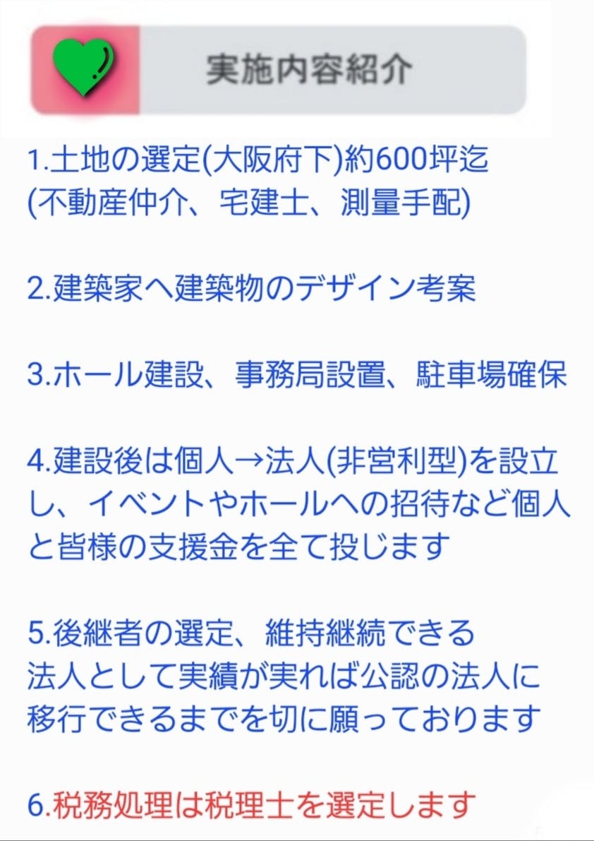 私たちは三重県で12年間、社会貢献活動をしながら地域交流を深めてきました。出身が大阪府でもありこの2024年1月7日から協力者と共に大阪府を拠点にして『一億人で 未来への夢を叶よう!』の支援金(会員)を募りたいと思います。 目的は日本国に明るい未来をテーマとしたインフォーマルサイドでの取り組みと自らが実行力を持って支援者の方々からの支援金で専門家と共働し、法人の立ち上げから地域に必要な資源や施設の建設までを実現するため、此方に掲載をお願い致しました。