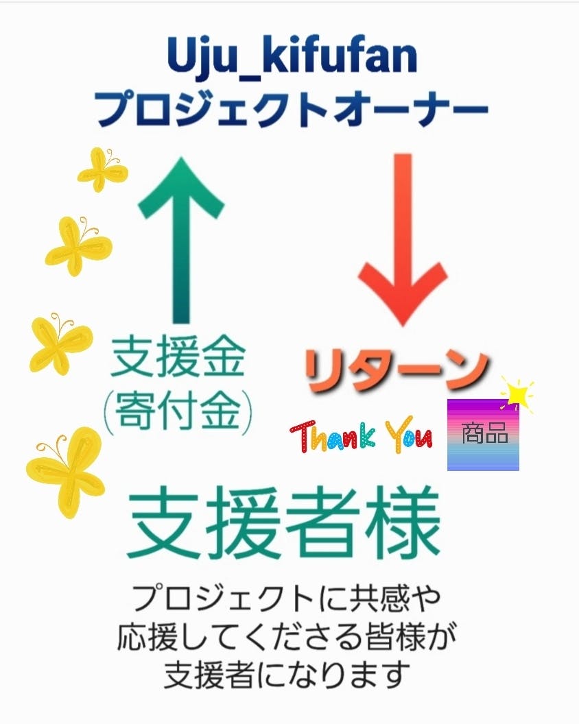 ご支援いただいた方には、プロジェクトの進捗状況や成果報告を定期的にお届けします。また、特別なイベントへの参加権(会員)、プロジェクトの一員としての名誉を得ることができます。さらに、プロジェクトが成功した場合には、地域の発展に貢献したことを認める会員証や感謝状等をお送りします。リターンは私達がシンボルとする『陽のあたる家』のオリジナル商品等をお送りいたします。