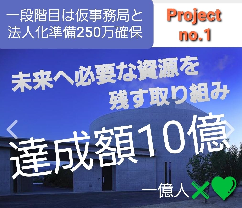 私たちは日本国に、明るい未来を永遠のテーマとし、後援者と協力して実現力を持って、地域に必要な資源や施設の建設など、幅広いプロジェクトを実現していきたいと切に考えています。今回、チャレンジしたいのは①土地の確保(300坪~600坪ぐらい)と交渉②併設した多目的施設(個人、団体問わず)と事務局の建設また、施設の1階に教会をイメージしたホール、駐車場等の設備、インフォーマルサイドでの後方活動に力を注ぐ個人として成長し続けるコミュニティ活動の場所を創設したいこと。③実績が実れば信用度のある法人格へ移行し、後継者を選定して存続、維持できる方向性の取り組みに力を注ぎたいと考えています。それが未来への貢献と資源になると信じて。。。