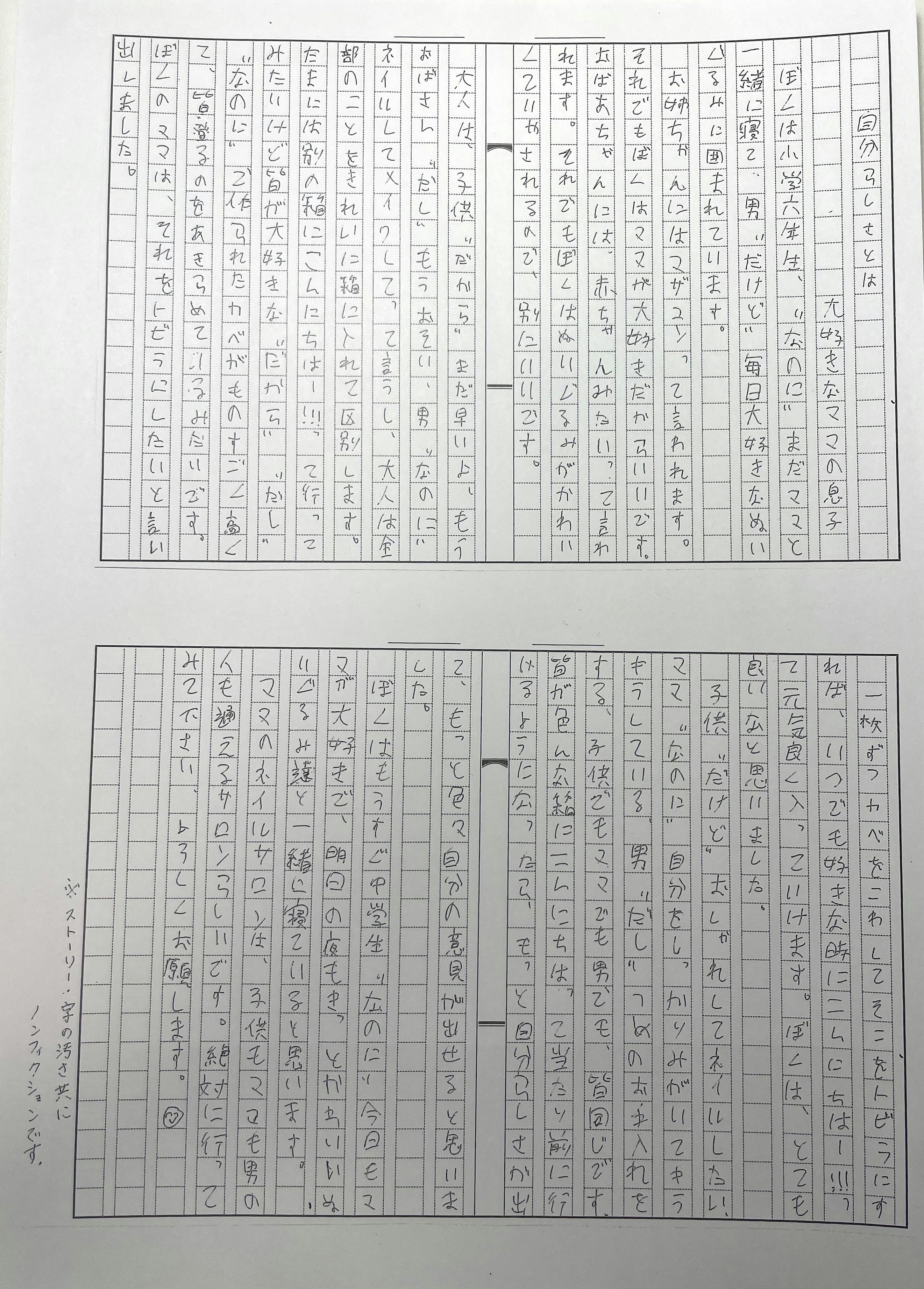 2024/02/20 10:33こんにちは、キャリーネイルです♪この前息子と、自分らしさについて一緒に考えてみました。大人になってしまった私には出てこないような素敵な考え方だったので、ぜひこれは文字に起こさなくては!と思い、せっかくだしと思って作文風にしてみました♡♡♡お分かりいただけますでしょうか?この字の汚さ、ノンフィクションです笑しかし言いたい事は伝わるかなと思います!笑せっかくなのでチラシにして配ってみました(^^)1人でもいいから、何らかの形で少しでも響いてくれたらなと思います(o^^o)私ももっと自分らしくやりたいことをやるぞーー!! もっと見る新浜公園真隣です♡♡♡