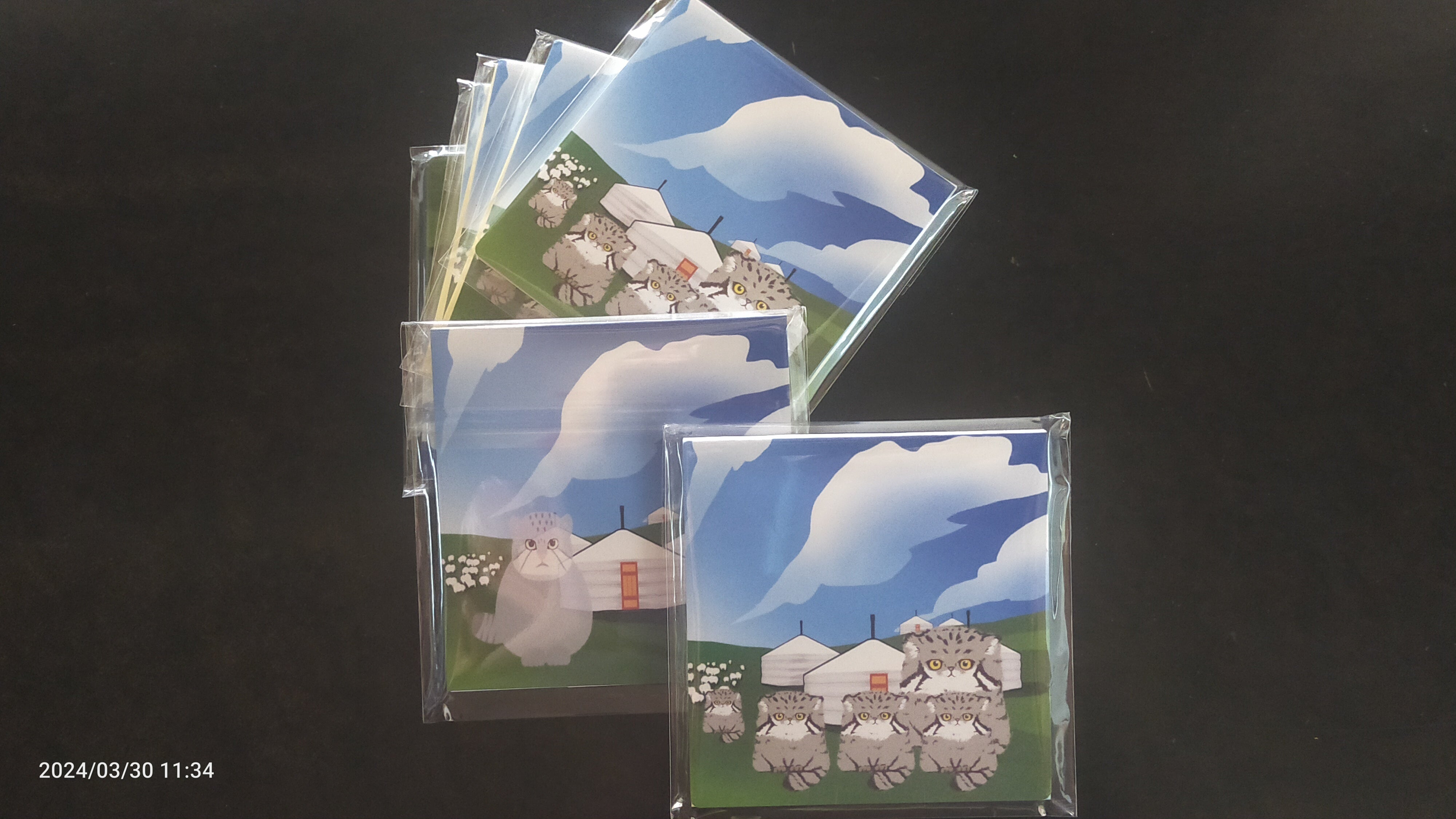 ノベルティ発注していた付箋(モンゴル高原で暮らすマヌルネコの一家)が、本日到着しました。画像は右:表紙、左:裏表紙 となっています。
