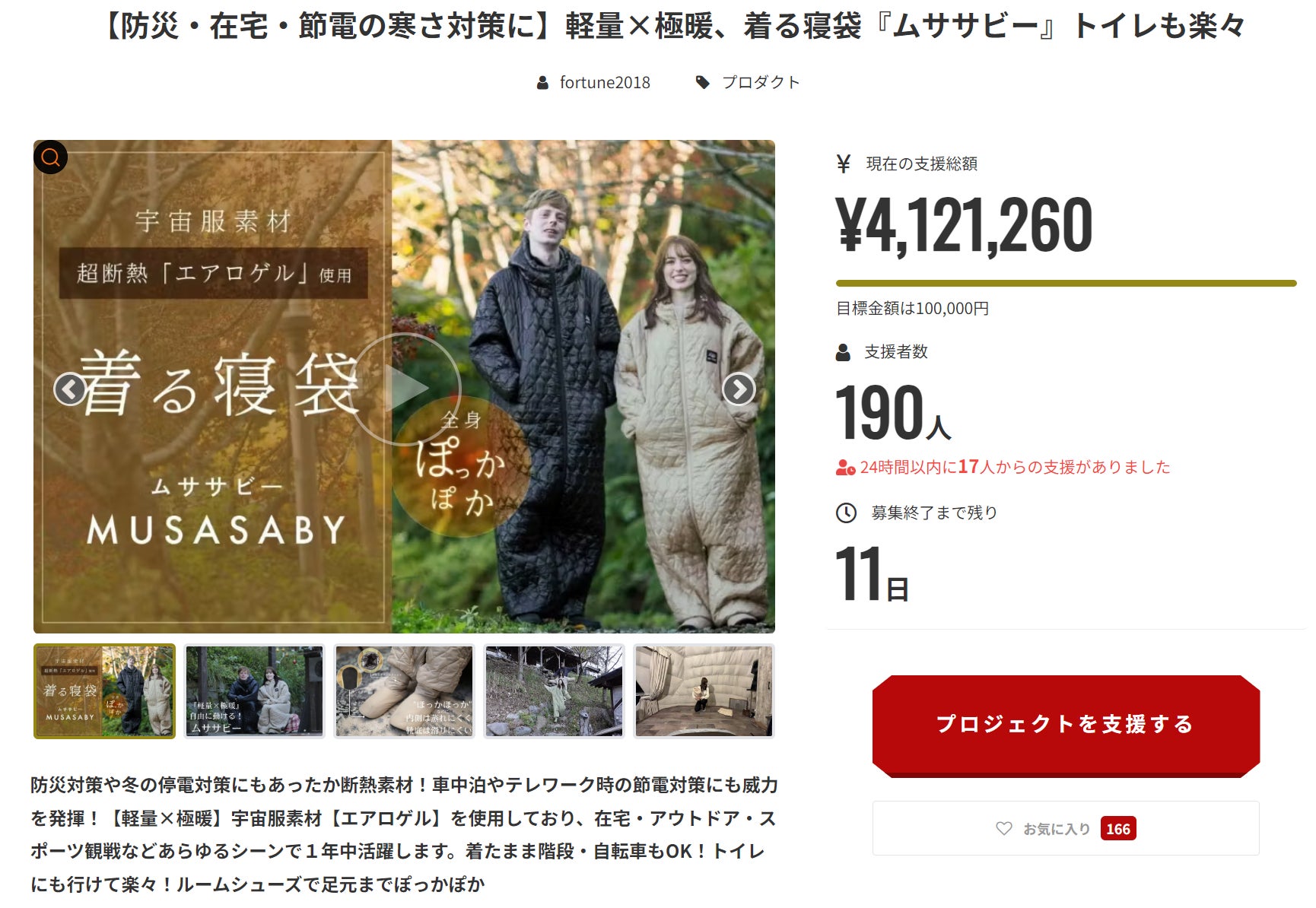 より多くの方々に着る寝袋『ムササビー』をお届けできように努力いたしますので、SNSなどでの拡散にもご協力を頂けますと幸いです。