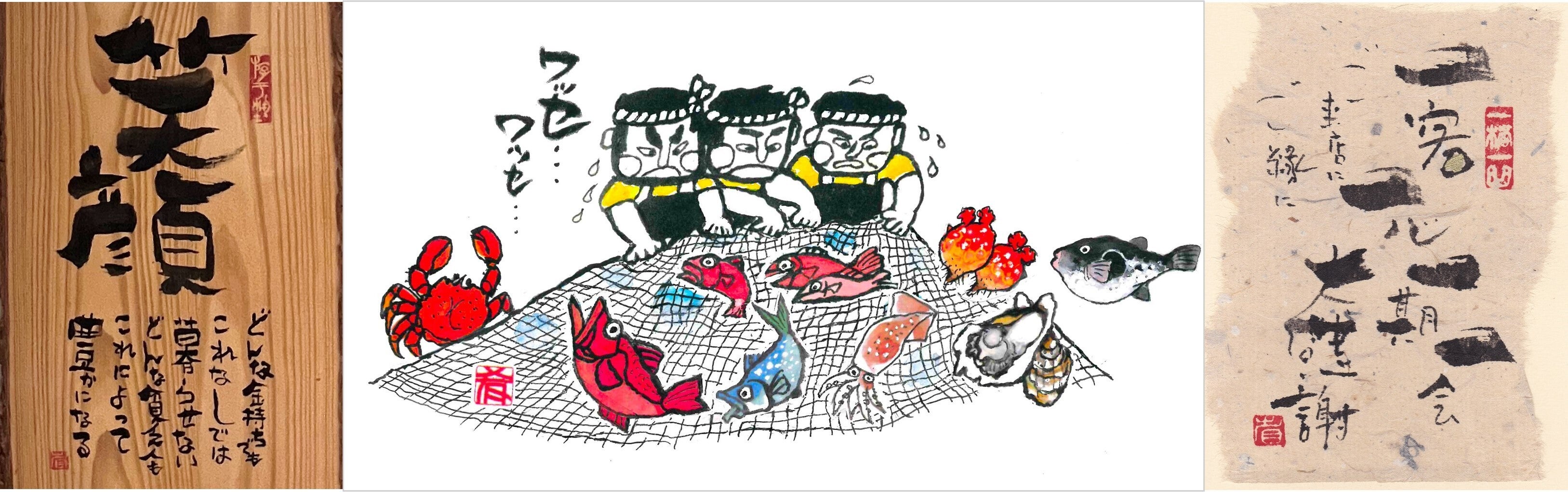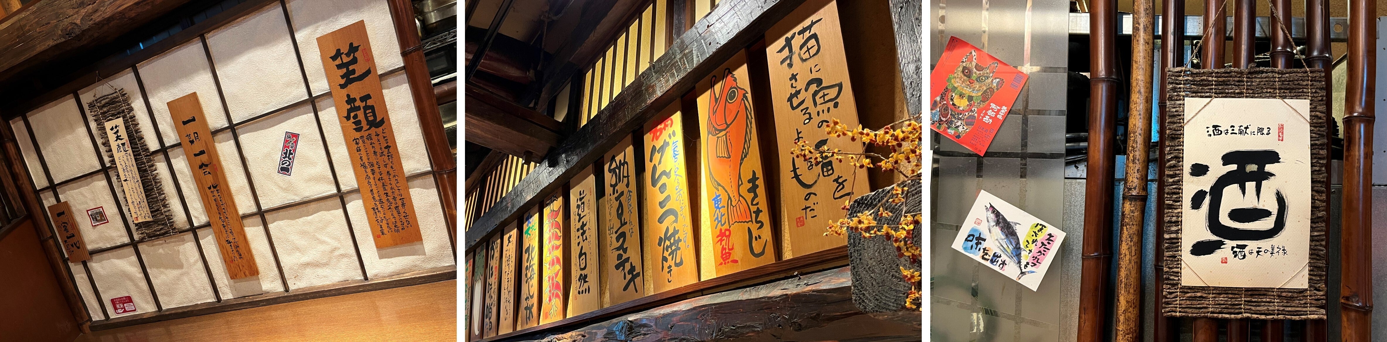 創業者である私の父は、料理人になる前は大工だったそうで、また最初の師(親方)の影響で独学で筆文字を極め、店内のいたるところに自作の板看板や作品が飾られています。