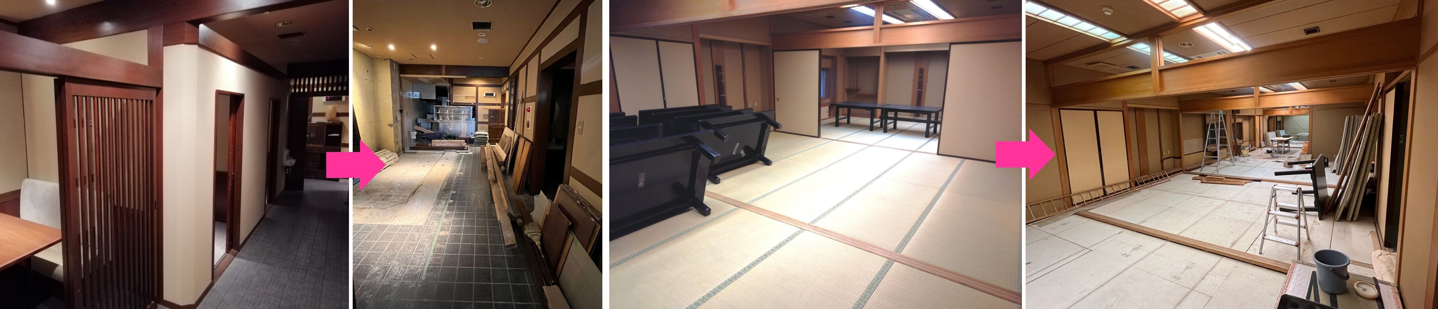 改装前の店舗は、料亭のような作りであり高級感は良いのですが、開放感も郷愁感もないため、1階の客席はすべて解体が必要となりました。2階は3部屋ずつを床の間で隔てられていたので解体し、50名以上でも利用でき、会議利用や寄席(落語)などのイベントを開催できるように改装したいと進めています。