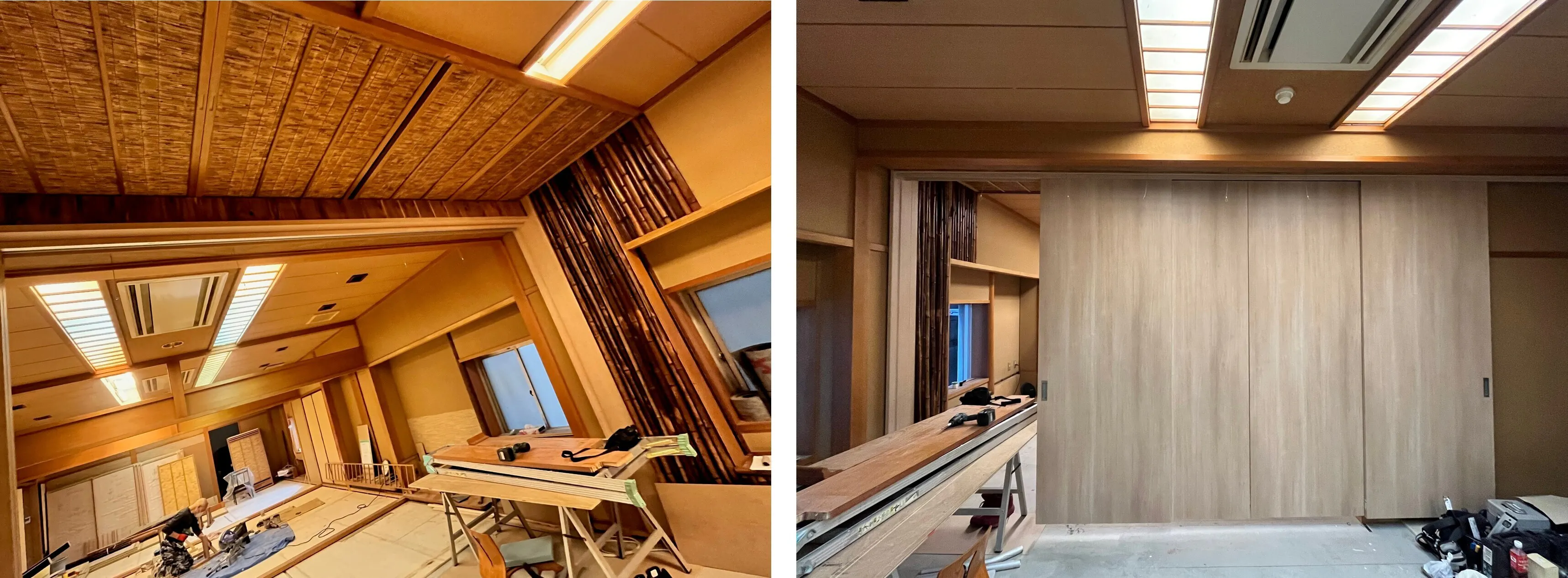 まずその床の間を壊し、加工した古竹や建具によって隙間を埋め、吊り下げ式の扉を取り付けました。コンサートではありませんが、イベントで利用いただく場合には、片側をステージ代わりにして緞帳(どんちょう)のように演出することもできます。