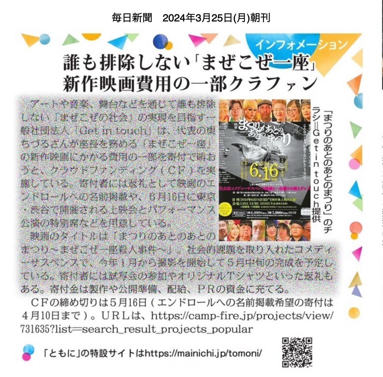 Get in touch事務局です。多くのご支援を頂き、事務局としても身が引き締まる想いです。ありがとうございます。今日は皆様に人気のリターンのご紹介を致します。一番人気は【エンドロールにお名前を掲載(小)】10,000円です。こちらはキャッチフレーズ等付けない「個人名」または「ニックネーム」で承っております。エンドロールは編集の作業上、4月10日が締め切りとなっておりますので、お早めにお申し込みください。二番人気は、【「映画『まつりのあとのあとのまつり~ まぜこぜ一座殺人事件~』社会派コメディーサスペンス映画と一夜限りの歌とダンス」公演チケット+パンフレット】15,000円です。6月16日(日)に行なわれる、完成お披露目上映&歌とダンスのパフォーマンス公演のチケットと、映画パンフレットのセットです。場所:LINE CUBE SHIBUYA(渋谷公会堂) 〒150-0042 東京都渋谷区宇田川町1−1日時:6月16日(日) 16時 開場 17時 映画上映 18時半 休憩 18時45分 パフォーマンス公演 20時 終了16時開場と同時に、Get in touch展や写真展もご覧になれますので、お早めにお越しください。ネクストゴールは『目標!支援者300人!!』どうか、お友達にもこの活動を広めて頂けますと嬉しいです!!
