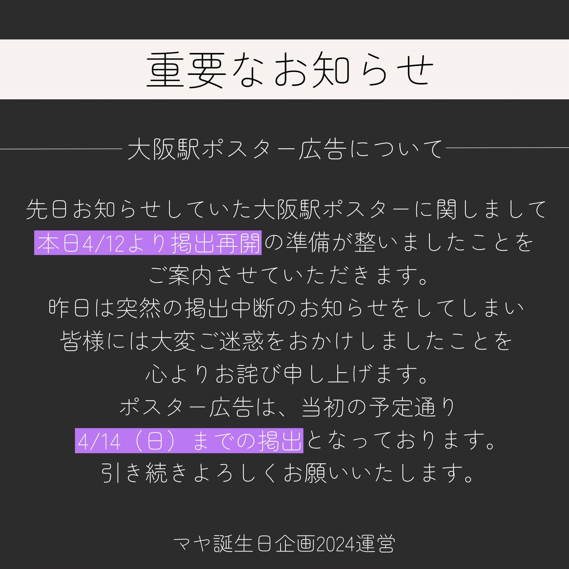 2024/04/12 17:16支援者の皆様、先日お知らせしていた大阪駅ポスターに関しまして、本日4/12より掲出再開の準備が整いましたことをご案内させていただきます。昨日は突然の掲出中断のお知らせをしてしまい皆様には大変ご迷惑をおかけしましたことを心よりお詫び申し上げます。ポスター広告は、当初の予定通り、4/14(日)までの掲出となっております。引き続きよろしくお願いいたします。マヤ誕生日企画2024 運営 もっと見る大阪駅ポスターについて重要なお知らせ