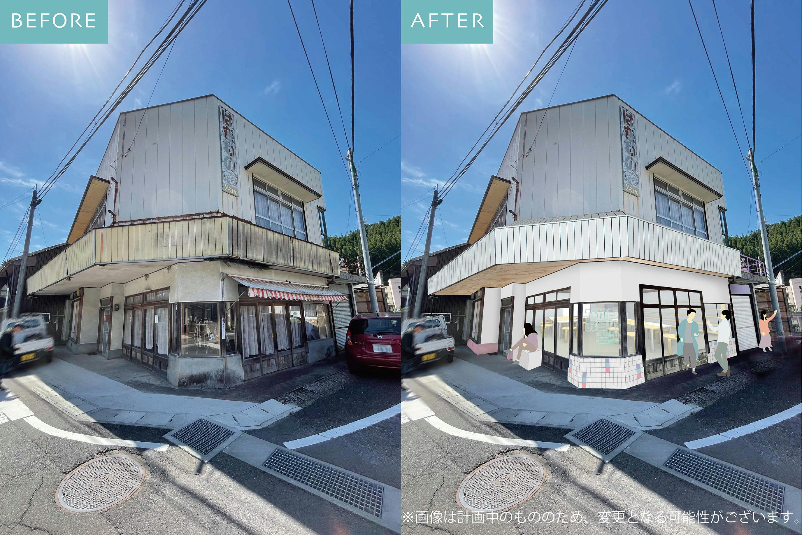 ▲現在の旧水谷履物店の外観(左)とイメージパース(右)