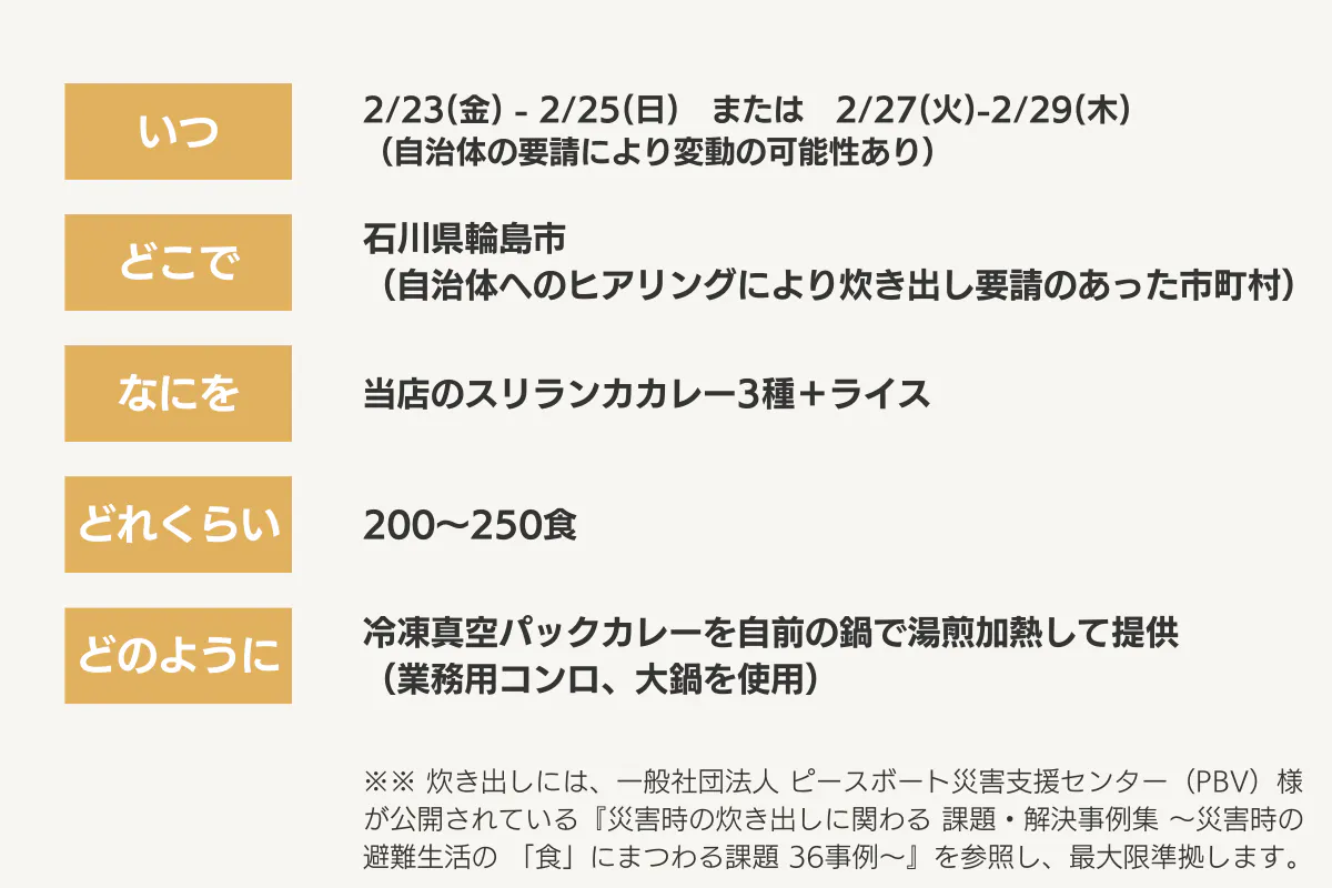 ③ 炊き出し体制を整備(カレーの仕込み、機材設備の用意、人員・移動ルート・近隣県滞在先の確保)・・・2月上中旬