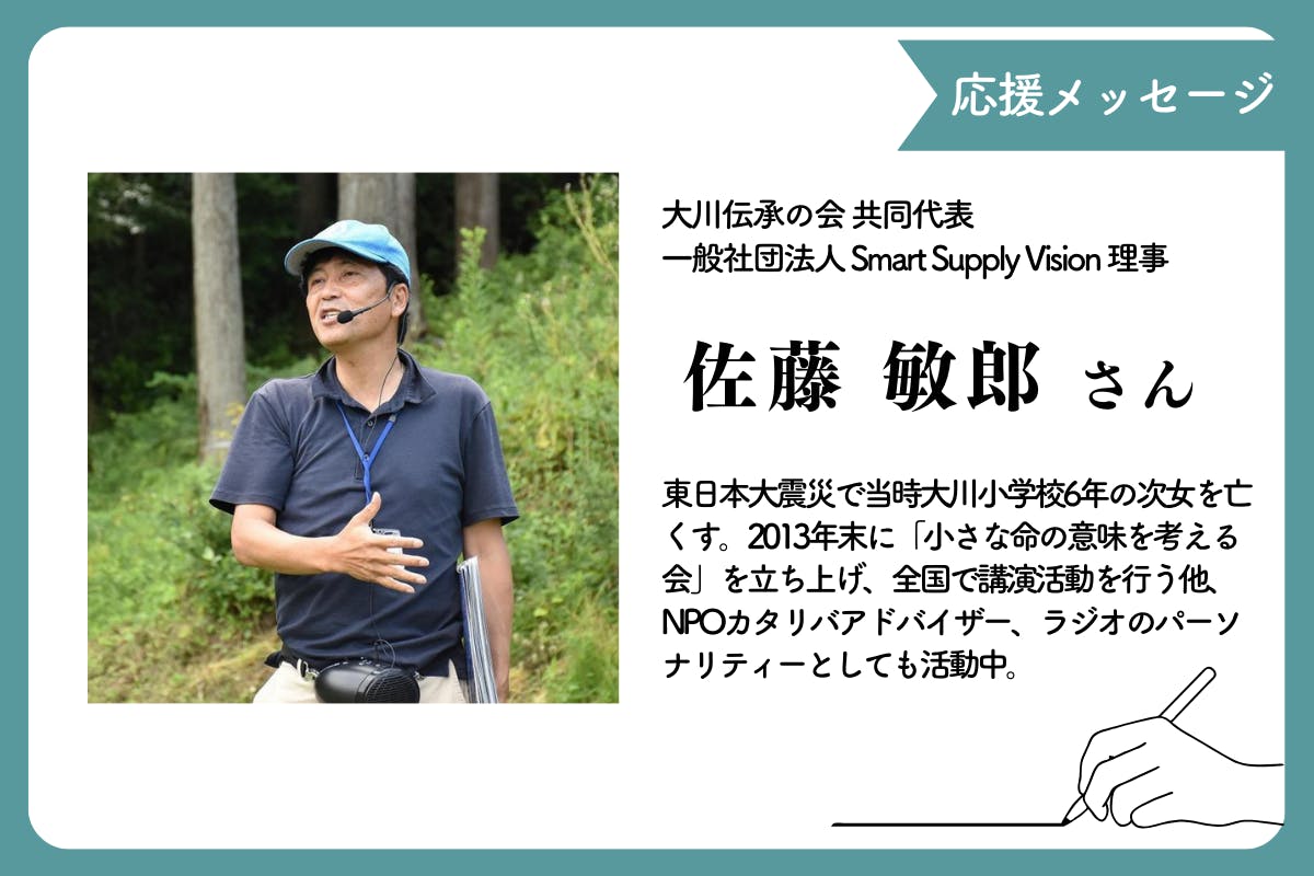 大川伝承の会共同代表、一般社団法人Smart Supply Vision理事の佐藤敏郎様から、本プロジェクトへの応援メッセージをいただきました。
